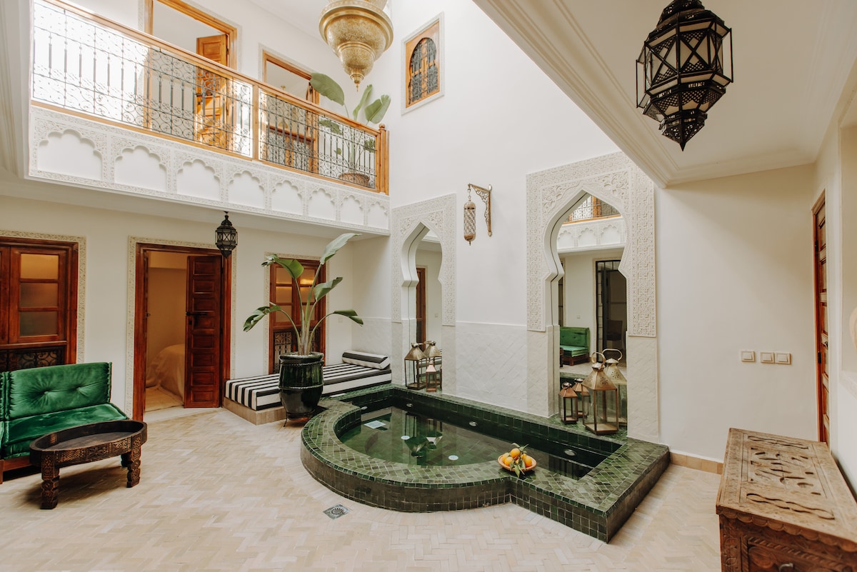 Un riad che vi trasporta direttamente nel fascino delle Mille e una notte, autentico, con sottili richiami moresco e andaluso, ma con tutti i comfort moderni. Una piscina privata, riservata esclusivamente agli ospiti del riad.. La posizione ideale: a pochi minuti dal Palazzo Reale El Badi, le Tombe Saadine, la vivace piazza Jemaa el-Fna. Ristoranti locali e internazionali a portata di mano. I taxi sono disponibili a meno di 10 metri dall’ingresso, per ogni destinazione in città.
