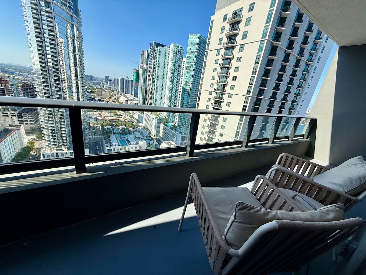 Sodobno oblikovalsko stanovanje v zgornjem nadstropju, dve spalnici, dve kopalnici, v osrčju Miamija. Uživajte v slogu, priročnosti in osupljivem razgledu na Miami z zasebnega balkona ter uživajte v panoramskih razgledih na ocean, jahte in mesto. Kuhinja ima nove naprave iz nerjavnega jekla. Dnevna soba se ponaša s popolnoma novim pametnim televizorjem 4K z jedilnico. Glavna spalnica ima izjemno udobno zakonsko posteljo in kopalnico ter elegantno zakonsko posteljo (Queen) s pametnimi televizorji. Popolnoma nove kopalnice, pralni in sušilni stroj v Penthouseu