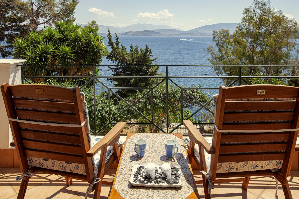 Sprostite se v tem udobnem in elegantnem prenočišču tik nad pristaniščem Kassiopi — najboljši kotiček v vasi! Ima 2 spalnici (1 zakonska postelja, 2 enojni postelji), raztegljiv kavč, klimatsko napravo v vsaki sobi, Wi-Fi in 1 kopalnico. Uživajte v jutranji kavi na balkonu s čudovitim razgledom na morje. Plaža Bataria je oddaljena le 5 minut. Kavarna in restavracija spodaj, supermarket za vogalom. Idealno za sproščeno družinsko ali skupinsko bivanje.