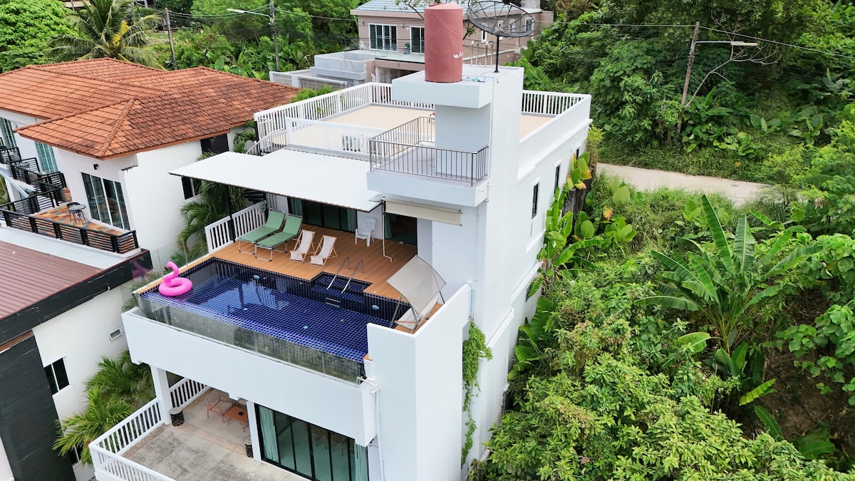 1. Vila se nahaja na odlični lokaciji: To je ena redkih vil za eno družino v Patongu.Plaža Patong, ulica z bari Bangla, Karon in druga osrednja območja so oddaljena le 5–10 minut vožnje z avtomobilom. Priročen prevoz, brez policijske ure ponoči, primerno za raziskovanje blaginje in vitalnosti Patonga.Hkrati pa je daleč od vrveža. Po doživetju nočnega življenja v Patongu lahko uživate v zasebnem in mirnem času. 2. Na novo prenovljeno prenočišče s sodobnim razkošjem: Vila, ki je bila zgrajena in prenovljena leta 2024, ima tri razkošne in preproste spalnice, ki lahko sprejmejo 6 gostov.Vsaka spalnica ima okna od tal do stropa, zunanje balkone ter suhe in mokre ločene kopalnice, ki zagotavljajo zasebnost in udobje vsakega gosta. 3. Oblikovanje prostora: Pritličje: prostoren zunanji salon in garaža.Obkroženi s tropskimi rastlinami, primerni za sprostitev in občutek narave. Drugo nadstropje: udobna spalnica, popolnoma opremljena kuhinja in dnevna soba s stekleno steno.Iz dnevne sobe lahko stopite naravnost v bazen.Dnevno sobo obdaja stena od tal do stropa, ki nudi čudovit razgled na zaliv Patong in tropski deževni gozd. 3. nadstropje: 2 zasebni spalnici in kopalnici, opremljeni z 2 udobnima velikima posteljama in posteljnino iz čistega bombaža, ki zagotavlja, da bodo gostje globoko spali. 4. Zasebni bazen: Vila ima zasebni bazen. 5 · Popolna kombinacija miru in vrveža: Ta vila za eno družino je idealna počitniška destinacija, ki združuje sodobno razkošje z naravnimi lepotami in zagotavlja udobno bivanje za naše goste. Upamo, da boste imeli sproščujoče počitnice.