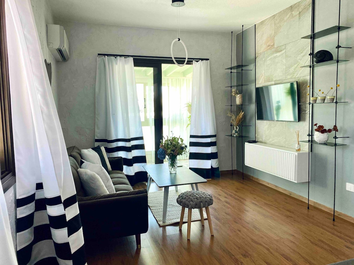Naše moderno, prenovljeno dvosobno luksuzno stanovanje se nahaja v prvem nadstropju majhne dvonadstropne stavbe ob aveniji Poseidonos. Javna plaža je čez cesto, le 150m stran. Avtobusna postaja(do/od letališča) je oddaljena 50m. Apartma je obdan z različnimi trgovinami, tavernami in bari, vse brez hoje. Gostje lahko uživajo v ogledu znamenitosti, vodnih športih in drugih aktivnostih na tem območju. Brezplačni Wi-Fi in varno parkirišče.Dobrodošli paket in priročnik na voljo.