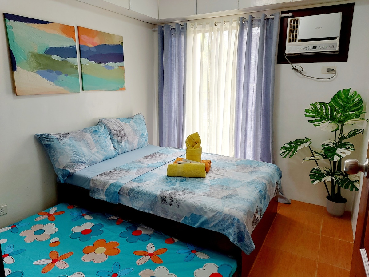 Stanovanjska enota je peš oddaljena od restavracij, trgovin, bolnišnice in nakupovalnega središča Ayala. Okolica je varna. V preddverju je dodeljeno 24-urno varovanje in osebje. V stavbi je dvigalo/dvigalo. Notranjost garsonjere je udobna in udobna. Na voljo je z 2 zakonskima posteljama. Sprejme lahko največ 3 goste. Internet WI-FI je na voljo - idealen za internetne klice in spletno deskanje.