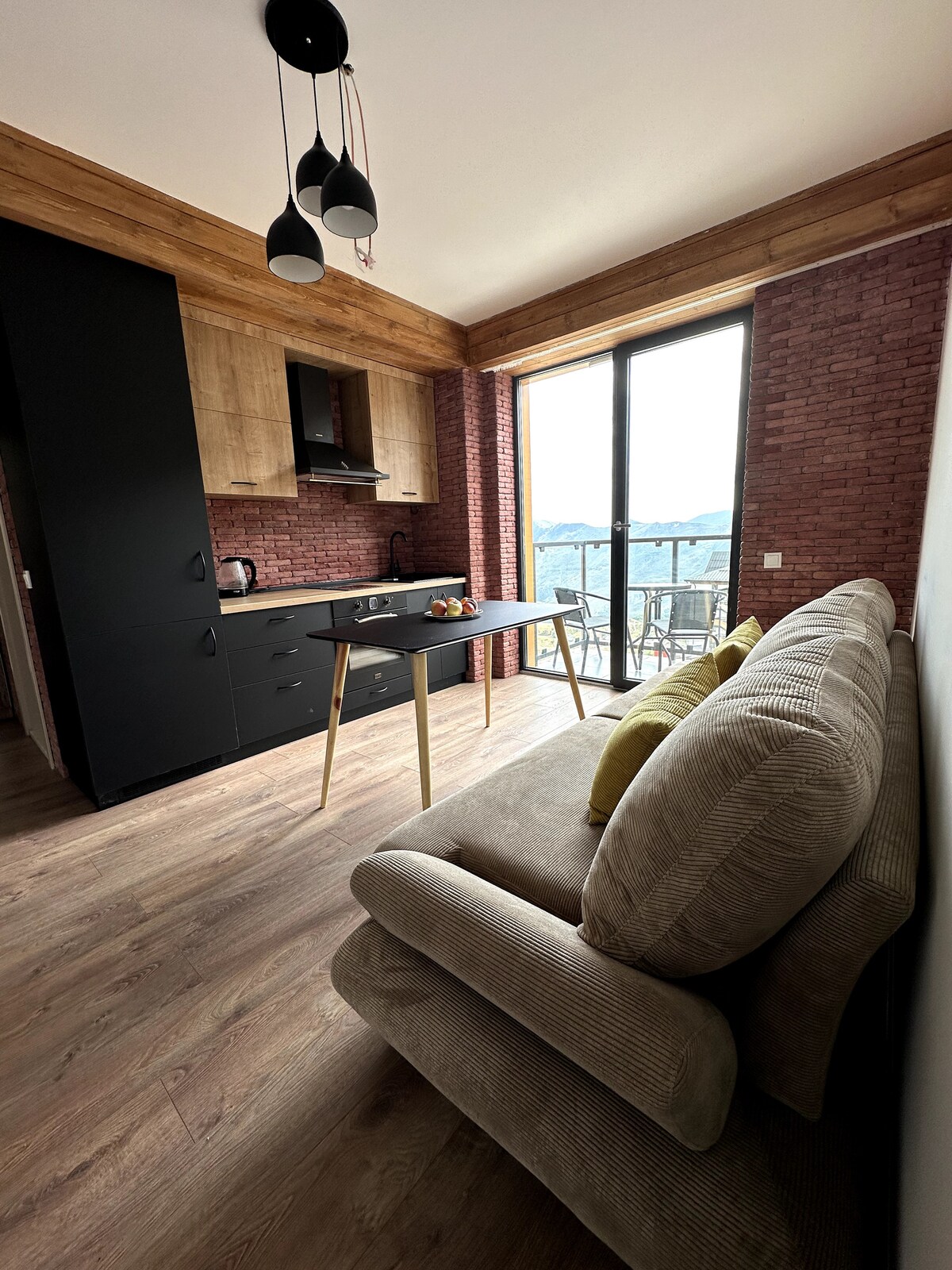 - Stanovanje se nahaja v Gudauriju, le nekaj korakov od smučarskega območja. - Stanovanje je udobno bivališče, z balkona boste videli čudovit razgled na gore. - Stanovanje je popolno za majhne skupine prijateljev, družin in parov, ki imajo radi smučanje, gore in čudovito naravo. Sodobna garsonjera ima kuhinjsko nišo z vso opremo , ploski zaslon in zasebno kopalnico s prho. - Stanovanje ima zasebno smučarsko posteljo - ima eno zakonsko posteljo in dvojni raztegljiv kavč. - samostojni vstop ( varnostna škatla za ključe)