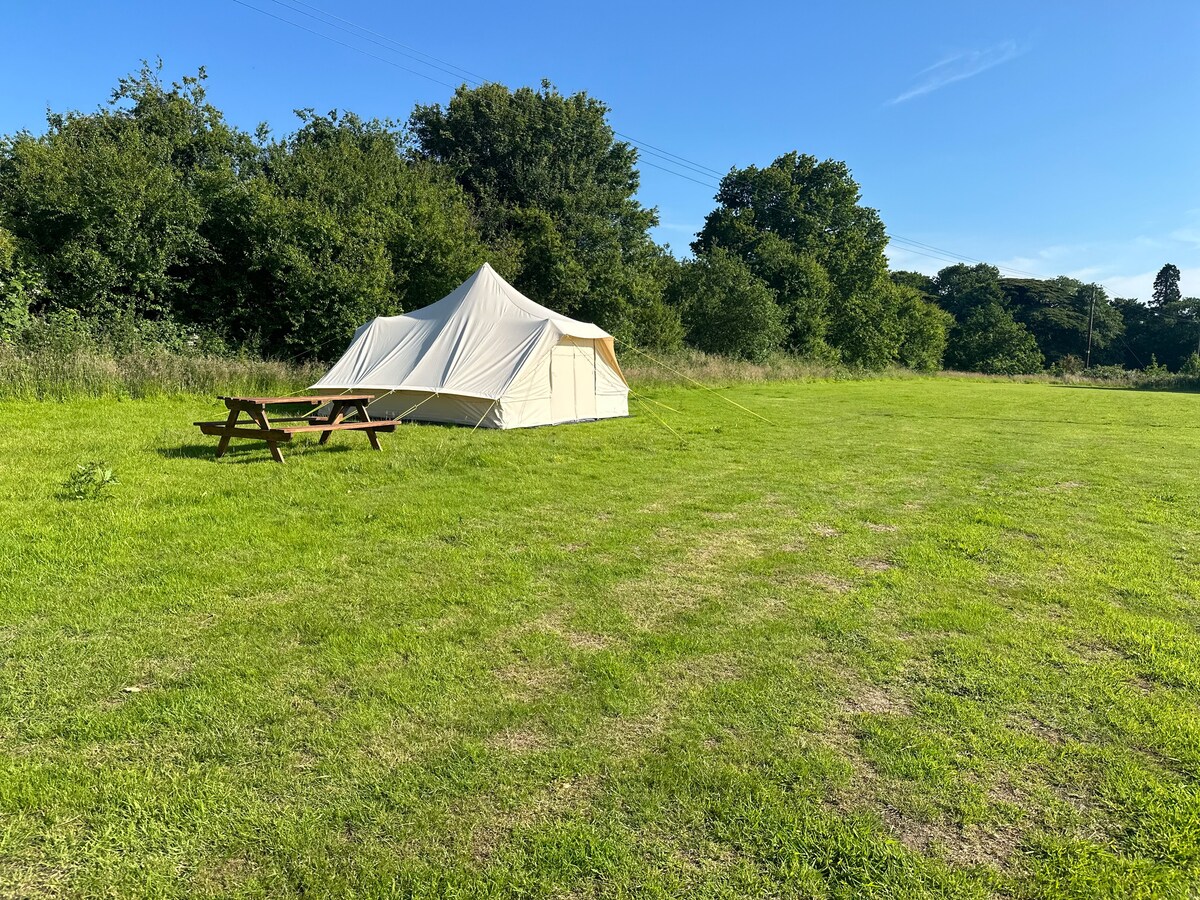 Beautiful 6M bell tent with all your home luxuries, king size bed and private bathroom situated at the edge of a small woodland. Total seclusion and privacy is guaranteed with this spot. Whilst it is surrounded by trees, it is open and a sun trap for sunbathing and not shaded.