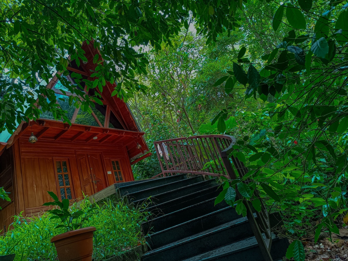 A cozy nature escape with valley views, part of the five-acre Mountain Villa eco-retreat—also home to our Stone cottage, Planters Cottage and Planters annex cottage. This private woodhouse room features a queen bed + attic loft (sleeps 4). Enjoy organic meals, scenic trails, and true off-grid living. Wi-Fi available, but mobile signal is weak—perfect for a digital detox. Complimentary Jeep transfer from Kurushumala Ashram included.