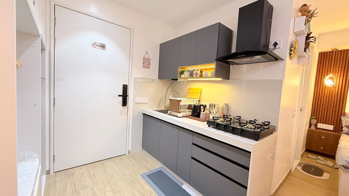 •Udoben bivalni prostor: sodobna dekoracija z plišasto zakonsko posteljo, kavčem in jedilnim kotičkom. •Popolnoma opremljena kuhinja: kot nalašč za kuhanje obrokov ali uživanje v jutranji kavi. •Oprema: hiter Wi-Fi, TV z ravnim zaslonom in klimatska naprava • Odlična lokacija: blizu javnega prevoza, nakupovanja in živahnega nočnega življenja. Ne glede na to, ali raziskujete znamenitosti Puneja, uživate v lokalni kulinariki ali pa se samo sprostite, ima ta garsonjera vse, kar potrebujete za nepozabno bivanje. Rezervirajte zdaj za popoln oddih!