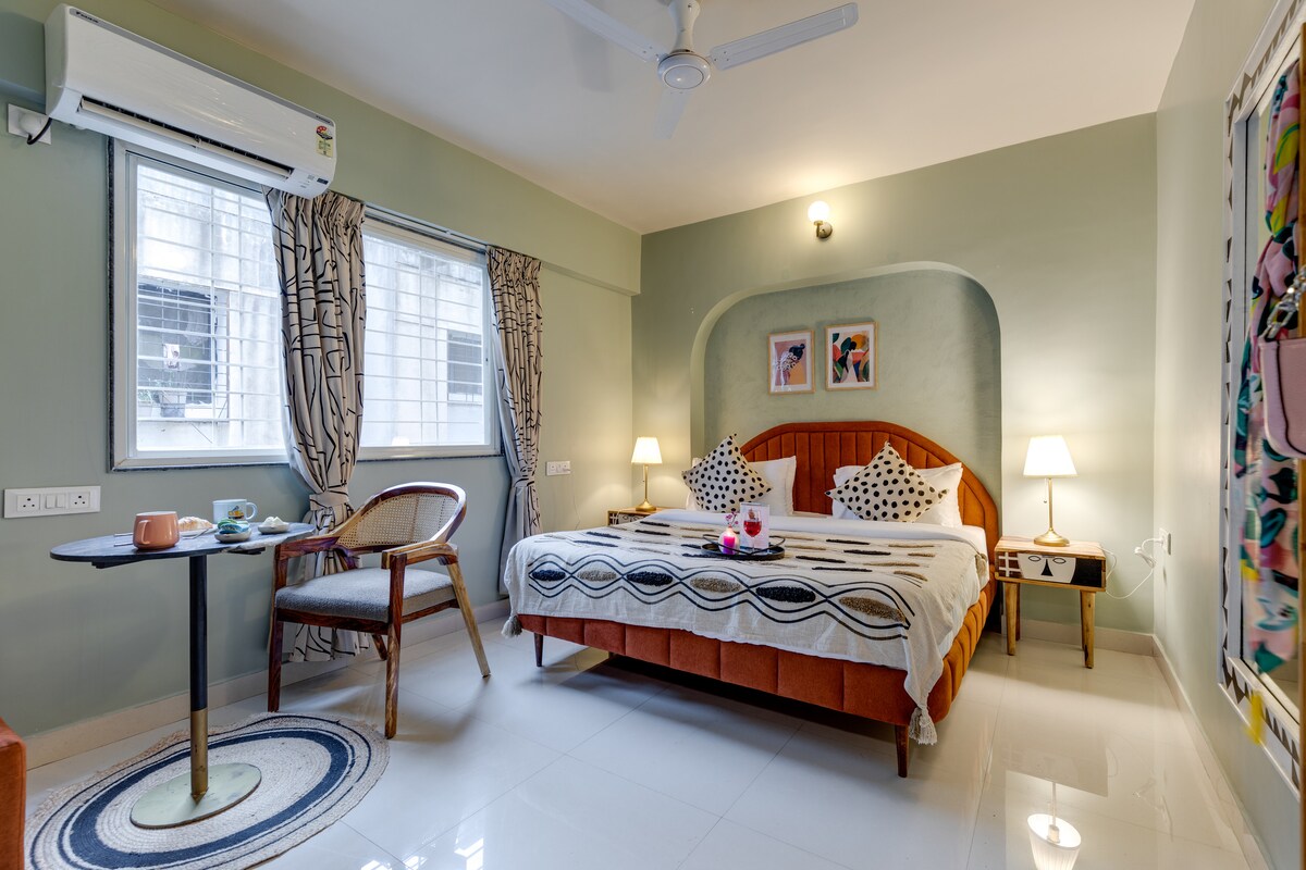Doživite miren oddih v naši prostorni sobi s kraljevsko obalo, kjer se sodobno udobje sreča z obalnim šarmom. Soba z veliko zakonsko posteljo in pomirjujočo stensko poslikavo ponuja popolno mešanico elegance in miru v osrčju Kharadija v Puneju.