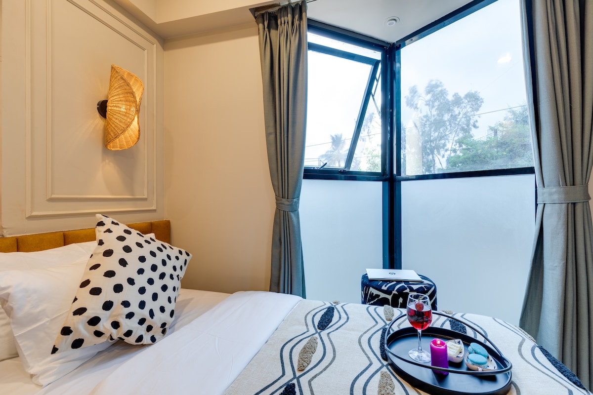 Doživite miren oddih v naši prostorni sobi s kraljevsko obalo, kjer se sodobno udobje sreča z obalnim šarmom. Soba z veliko zakonsko posteljo in pomirjujočo stensko poslikavo ponuja popolno mešanico elegance in miru v osrčju Kharadija v Puneju.