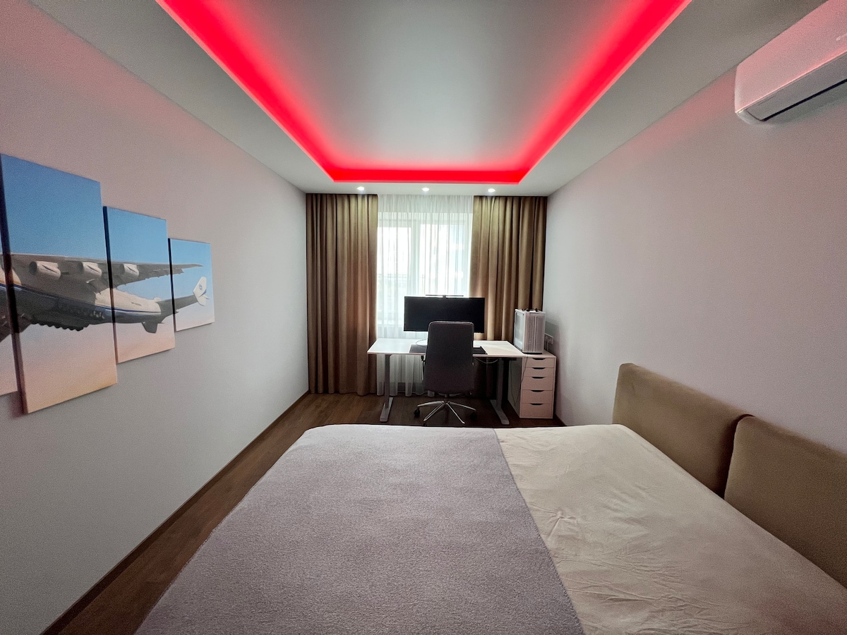 Apartment has new Modern interior with nice view of Manhatten, kitchen, abthroom and balcony with nice view on Lenina prospect, one of the nisest street of Kharkov. Safe entrance door at an entrance. There is metal door in apartment. King size bad an