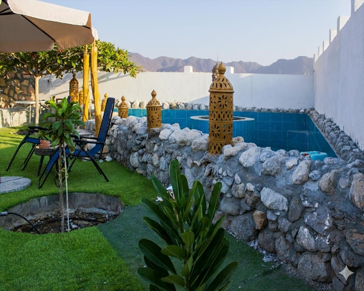 Enjoy a quiet stay in a beautiful house on a private farm surrounded by trees and green spaces with a private pool . The place is ideal for families and those seeking to relax away from the hustle and bustle of the city. The house is fully equipped (3 comfortable rooms, kitchen, outdoor seating, grill). Close to services and main roads, it’s an easy drive from dubai ,it offers a great view of nature. An authentic rural experience with luxury and comfort in the middle of the desert