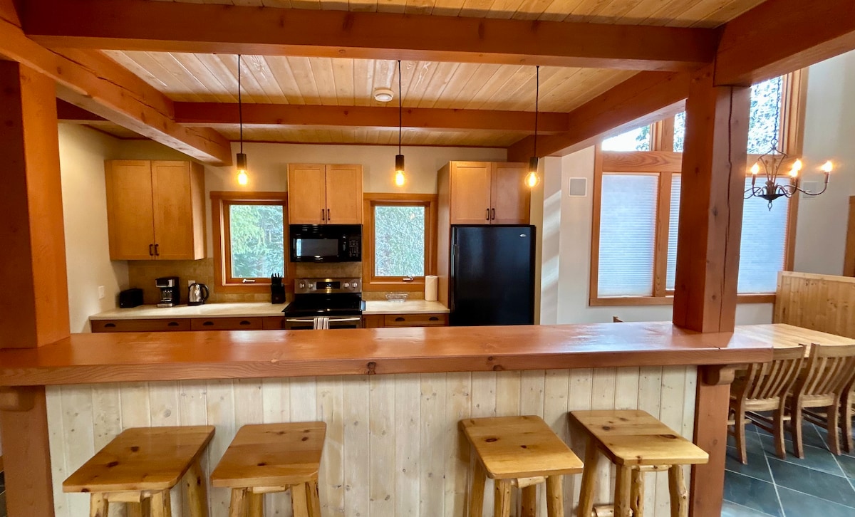 Ta prostorna lesena koča z okvirjem je odlična skozi vse leto! *Popolnoma nova masažna kad je nameščena jeseni 2025 Stopnice od urejene smučarske poti, ki vas popelje do dvigal in gondole letovišča. Po smučanju se lahko odpravite po drugi urejeni poti, ki se konča neposredno čez cesto od prenočišča. Pravi smučarski in smučarski izlet! V bližini so poti za gorsko kolesarjenje, pohodništvo, jezera, restavracije, kavarna in mesto Golden. Hiša je prostorna in odlična za srečanja z odprtim konceptom. Vse, kar potrebujete za uživanje na počitnicah