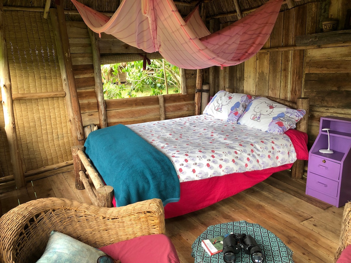 Apiary Cottage se nahaja tik ob hribu od naše kmetije. Ta soba je postavljena visoko, med vejami evkaliptusa in pticami tkanja, s pogledom na savano s terase in deževnega gozda skozi okno. Mirno sedite izven dosega med kraterji in spektakularnimi razgledi, obiščite sproščujoč umik ali ogled vulkanske regije. Vaše bivanje pomaga podpre naš projekt, Enjojo Farms: ohranitvena pot za zmanjšanje konfliktov med ljudmi in spodbuja trajnostne čebelarske prakse.