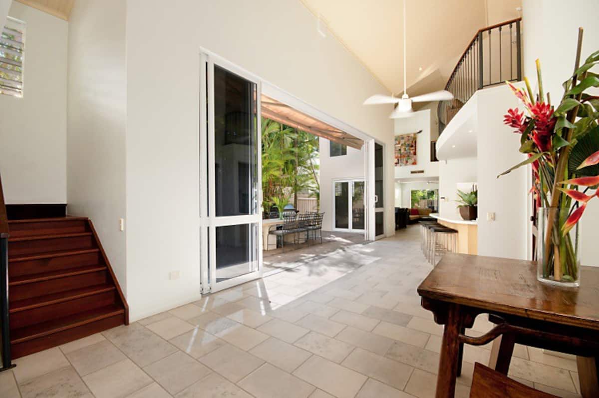 Vstopite, odložite torbe in se sprostite v našem zasebnem svetišču, ki razkriva vrhunsko bivanje in očarljive panoramske razglede, ki vas bodo očarali. Sprostite se in se ohladite v neskončnem bazenu z morsko vodo, ki vam omogoča, da uživate v osupljivem deževnem gozdu in neskončnih razgledih. Coral Sea Drive se nahaja na 2,6 hektarjih osamljenih vrtov deževnega gozda, le 5 minut stran od soteske Mossman, 15 minut od pristanišča Douglas in okoliških plaž ter 5 minut vožnje do mestnih ugodnosti.