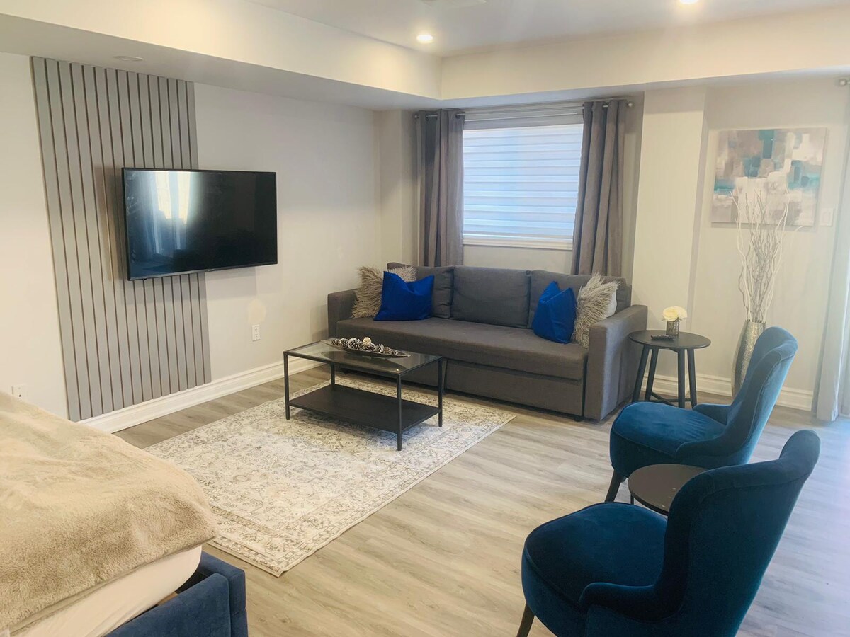 Ni rezervacij tretjih oseb! Ni zabav! Ni obiskovalcev! Na tone nadgradenj in vrhunskih sodobnih funkcij! Visok strop nad kletno enoto. Odprt koncept bivalnega prostora vključuje kamin, pametno televizijo, popolnoma opremljeno kuhinjo, pralnico in veliko garderobno omaro 1 parkirišče Uživajte v slikovitih poteh v Woodbridgeu 10 min do prodajnih mest Vaughan Mills in kanadske čudežne dežele 15 min do letališča Pearson Zunanji nadzor je na voljo 24 ur na dan. Ena kamera nad dovozom. Ena kamera nad vhodnimi vrati in ena pred nevihtnimi vrati v enoto Airbnb