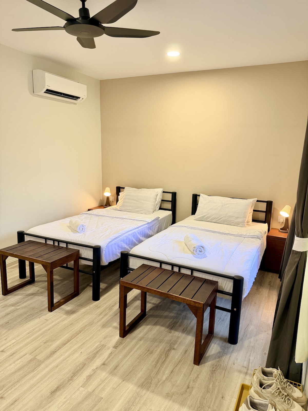 To je suita z dnevno sobo + spalnico in kopalnico. Če želite priti do spalnice, vam ni treba hoditi mimo skupnega bivalnega prostora (samo hodnik si delijo z drugimi gosti). Vrata so zavarovana s sistemom pametne ključavnice za samostojni vstop in izstop. Naše bivališče se nahaja v osrednji in mirni soseski. Namestitev je prostorna in obdana z zelenicami. Gostje lahko podnevi uživajo v priročnosti [5 minut do letališča, 10 minut z avtomobilom do starega mestnega jedra in Ipoh Parade] in imajo mirno in sproščujoče bivanje ponoči.