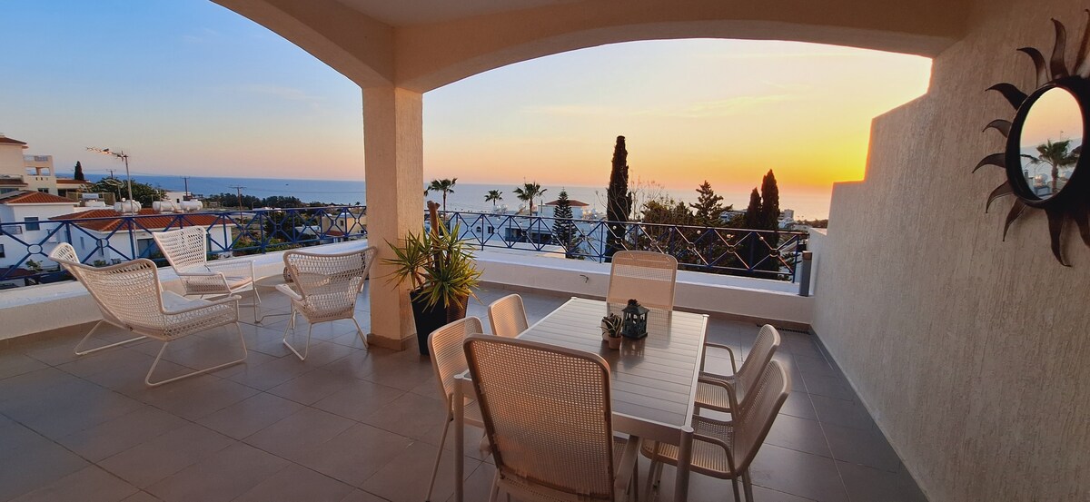 Povprečna ocena: 4,83 od 5, št. mnenj: 12Svetlo stanovanje s pogledom na morje s sončnim zahodom in bazenom • Paphos