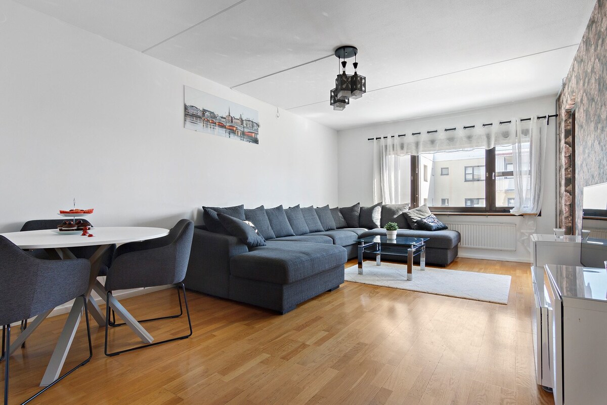 Prostorno in v celoti prenovljeno stanovanje s površino 82 m², ki je od podzemne železnice oddaljeno le 140 m. Do središča Stockholma pridete v 19 minutah, Kista Galleria pa v 7 minutah. Vključuje 2 spalnici (King + 140x190 cm), kopalnico z WC-jem, balkon, hiter Wi-Fi, TV in popolnoma opremljeno kuhinjo s pripomočki in začimbami. Supermarket je oddaljen 140 m. Svetla in sodobna z veliko in udobno dnevno sobo - kot nalašč za družine, pare ali poslovna bivanja. Ne sprejemamo zahteve, če vaš osebni dokument ni potrjen.