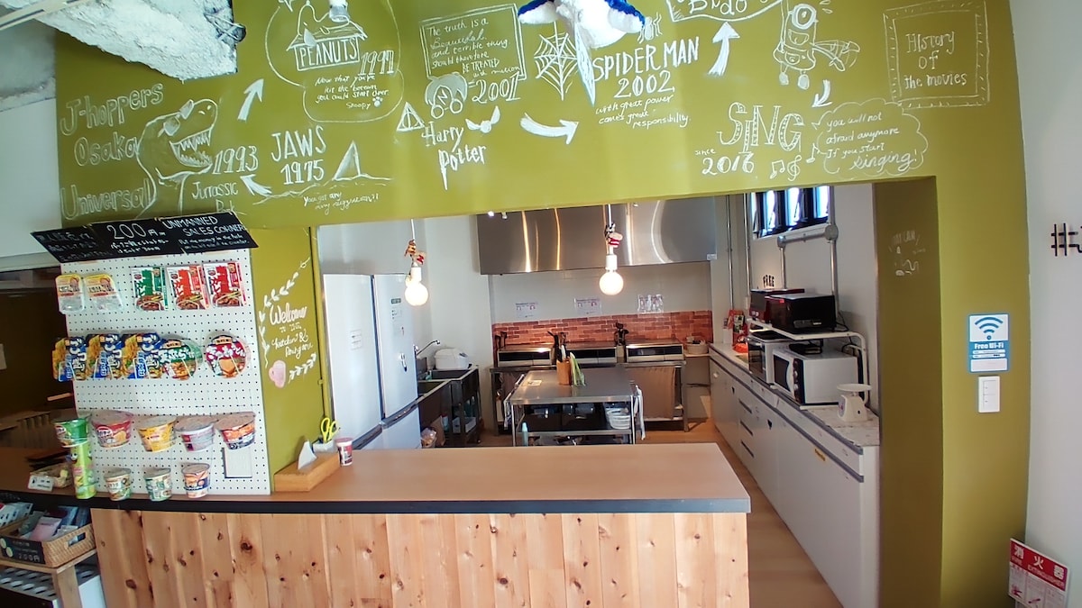 Smo sodoben butični hostel v Shinsekaiju, ki je od znamenitega simbola Osake oddaljen le nekaj korakov hoje od stolpa Tsutenkaku. Potovanje po Osaki je enostavno, saj se nahajamo v bližini treh postaj (linije podzemne železnice JR Line, Midosuji in Sakaisuji). Nahajamo se tudi v neposredni bližini osrednjih območij, kot je Namba. Okoli našega hostla je veliko poceni lokalnih restavracij, pa tudi supermarketov in trgovin. Hostel ima skupni dnevni prostor s predelanim stanovanjem s kavarno in trgovino z ploščami. Kavarna, ki se nahaja v prvem nadstropju, streže pečeno kavo in nekaj obrokov. Predvajajte lahko vse plošče, ki jih želite poslušati. V kavarni včasih prirejamo glasbene dogodke v živo in kulinarične zabave, zato obstaja veliko priložnosti za spoznavanje lokalnih prebivalcev Osake. Vabimo vas, da se sprostite v naši stavbi, uživate v prijaznem, zabavnem in intimnem vzdušju, deskate po našem vrhunskem internetu(Wi-Fi) in se počutite kot doma!