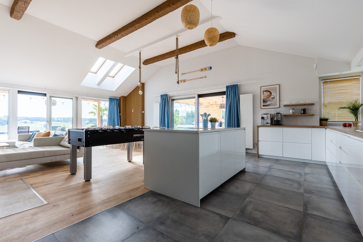 Dobrodošli v našem udobnem stanovanju Nahaja se v mirni vasici, le nekaj metrov stran od slikovitega jezera. Notranja ureditev združuje sodobno udobje z naravnimi očarljivimi lesenimi detajli, skrbno izbranimi dekoracijami in toplim vzdušjem ustvarjajo edinstven prostor za sprostitev Velika okna prepuščajo veliko svetlobe in ponujajo osupljiv razgled na okoliško naravo. ❗️ Uporaba savne in jacuzzija 300 zlota ob prihodu za les.️