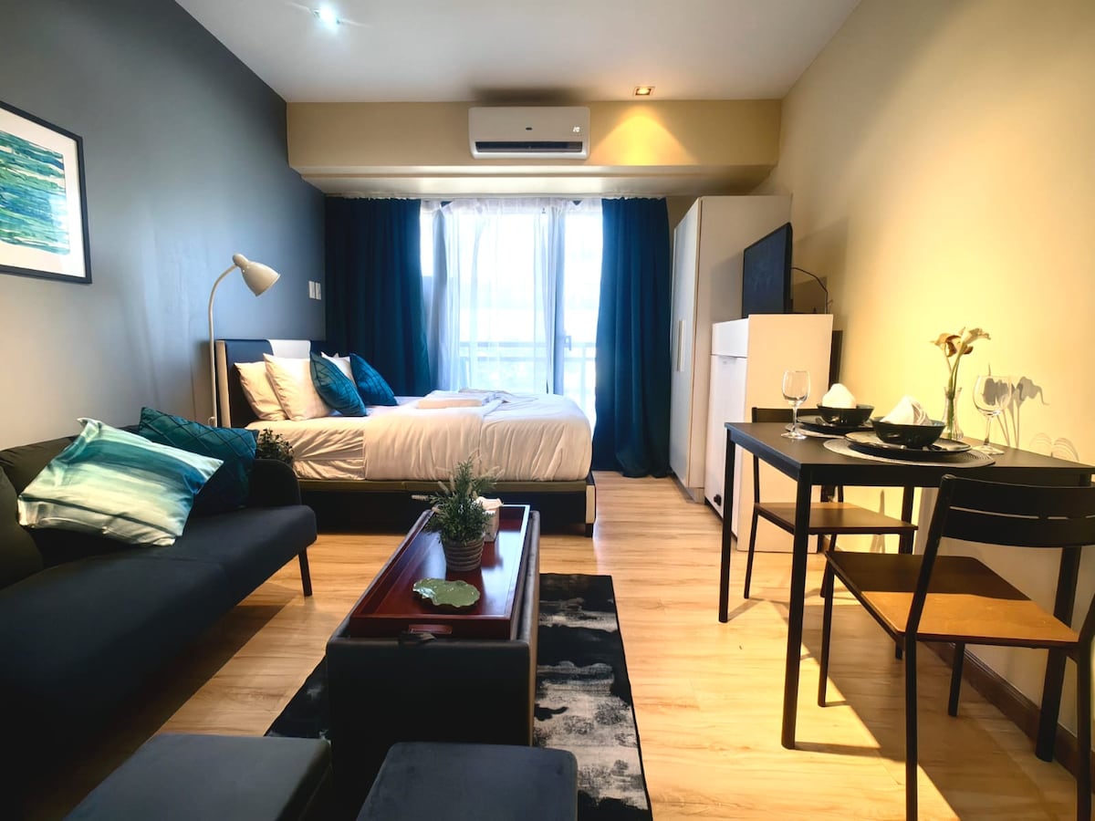 Dobrodošli v elegantni garsonjeri v Knightsbridge Residences! Sprostite se v tej elegantni industrijski garsonjeri v osrčju Poblaciona v Makatiju. Uživajte v udobnem dnevnem prostoru s 50-palčno pametno televizijo, elegantno kuhinjo, osvetlitvijo razpoloženja in zasebnim spalnim prostorom. Idealno za samostojne popotnike ali pare. Gostje imajo brezplačen dostop do bazena, telovadnice, knjižnice, igralnice in jedilnice. Le nekaj korakov stran od trgovskih centrov, kavarn, restavracij in bankomatov - vse, kar potrebujete za udobno bivanje v mestu.