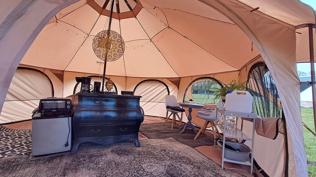 Geniet van de natuurgeluiden in deze unieke accommodatie. Vanuit de tent kijk je uit over de landerijen en rozenbottels. Naast 2 volwassenen kunnen er nog 2 kinderen verblijven. Zij slapen op een kindermatras op de grond. Bij warm weer open je alle ramen, zodat de tent lekker door waait. Verder beschik je over een koelkastje, filter koffiezetapparaat, waterkoker, gasstel met 3 pitjes, borden, bekers en bestek, BBQ, vuurkorf. Gratis wifi bij het sanitair-gebouw.