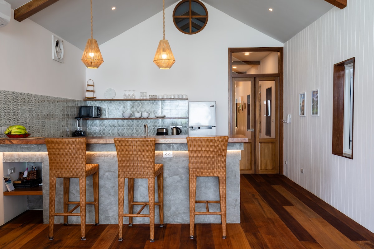 Zasebna otoška hiša s pogledom na morje. Skrivališče na samem na hribu stran od ceste. Naše bivališče ponuja miren umik s spektakularnim razgledom na zaliv Phang Nga. Uživajte v zasebnem prostoru, stran od prometnih turističnih točk. Ali pa preživite čas na plaži, ki je oddaljena le 300 metrov. Ta hiša ima popolnoma ameriško kuhinjo in velik notranji zunanji prostor za sedenje v obeh nadstropjih.