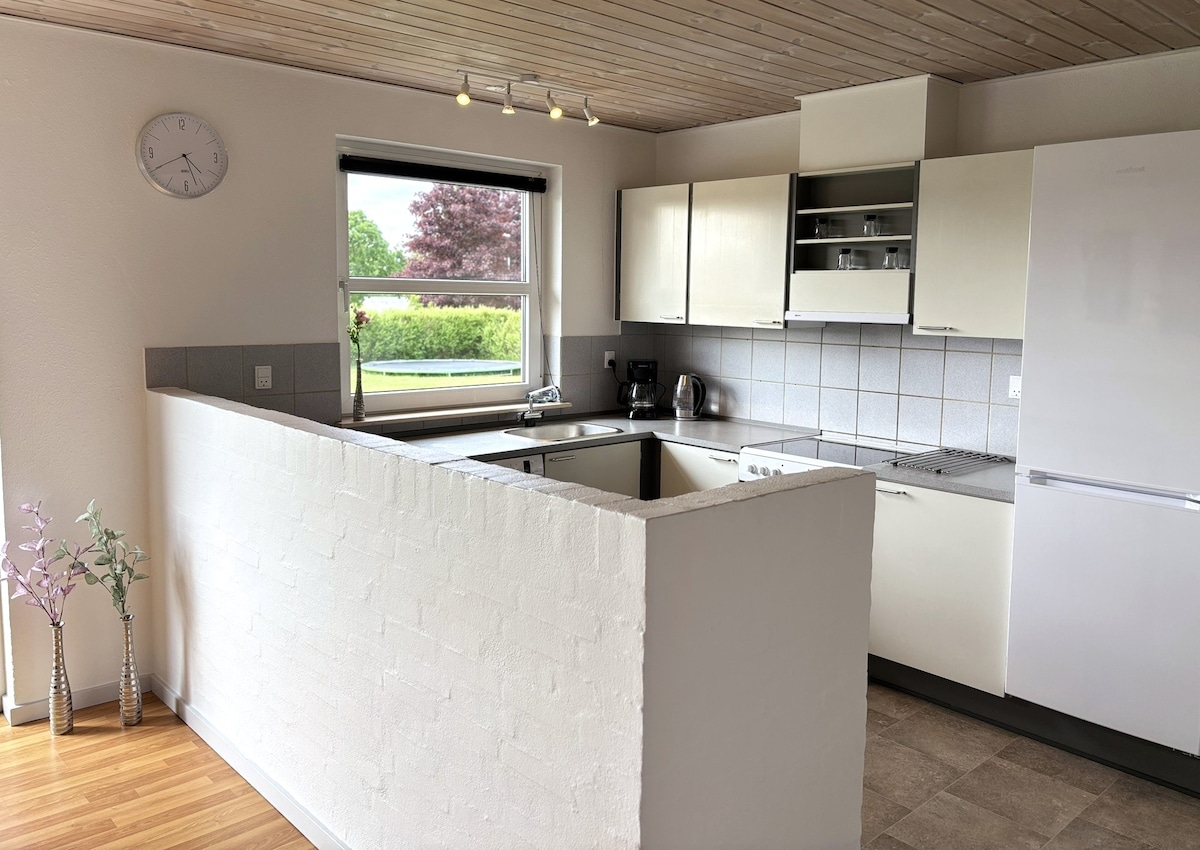 Newly built apartment, 50 m2. Includes 2 double rooms, small kitchen with fridge, coffee maker, mini oven, a single electric hob etc. Living room with sofa, dining area and bath/toilet. Private entrance, parking right by the door. Peacefully and idyllically located by Skamlingsbanken, 10 min. drive south of Kolding and E45. Lots of opportunities to enjoy nature in the area, large path system with beautiful views. Close to the child-friendly Binderup beach.