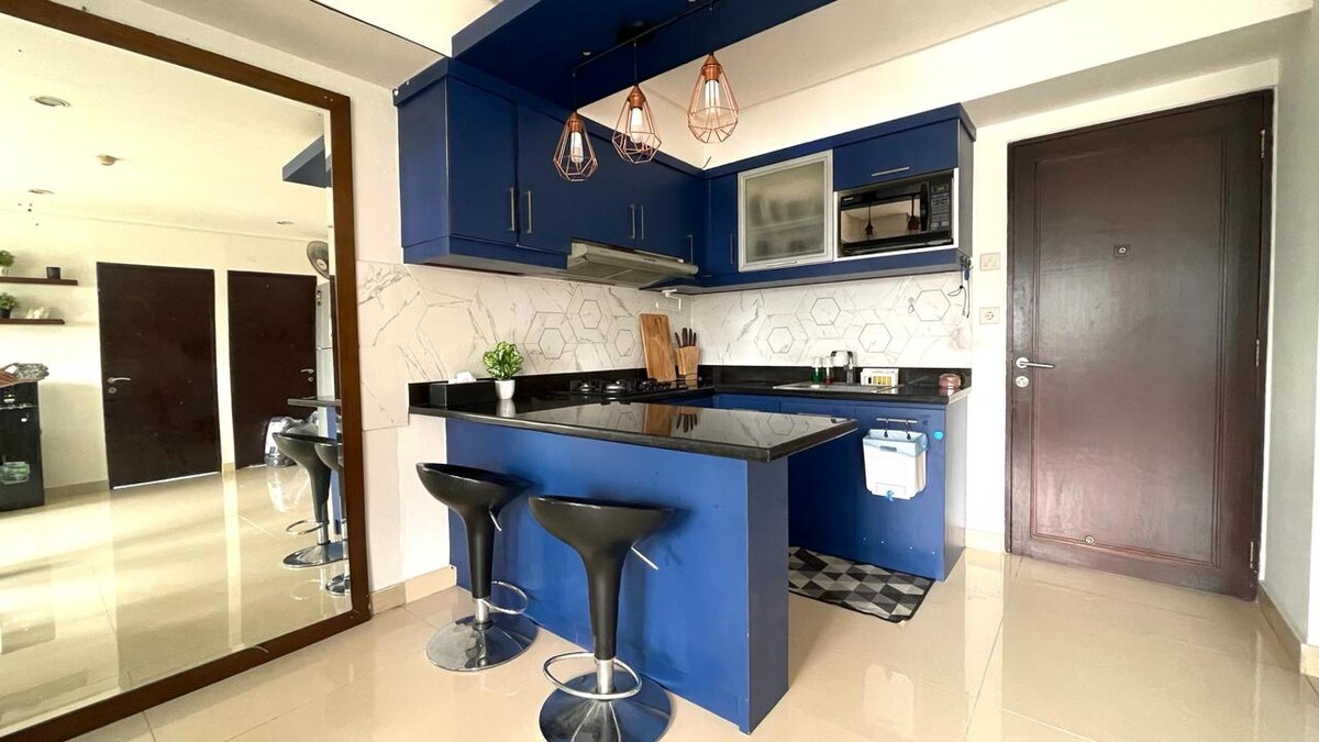 Sprostite se v tem mirnem, elegantnem prostoru v Južni Džakarti, tik ob 7 hektarskem eko parku. Industrijska zasnova, razkošno studio popolnoma opremljeno stanovanje : popolnoma opremljena kuhinja (štedilnik, hladilnik, Nespresso aparat, vsa oprema za kuhanje in jedilnico), 43-palčni android TV, kavč, zakonska postelja, kopalnica z vročo prho. Objekti stavbe vključujejo bazen, jacuzzi, telovadnico in parkirno mesto. V 22. nadstropju imate čudovit razgled na mesto Jakarta.