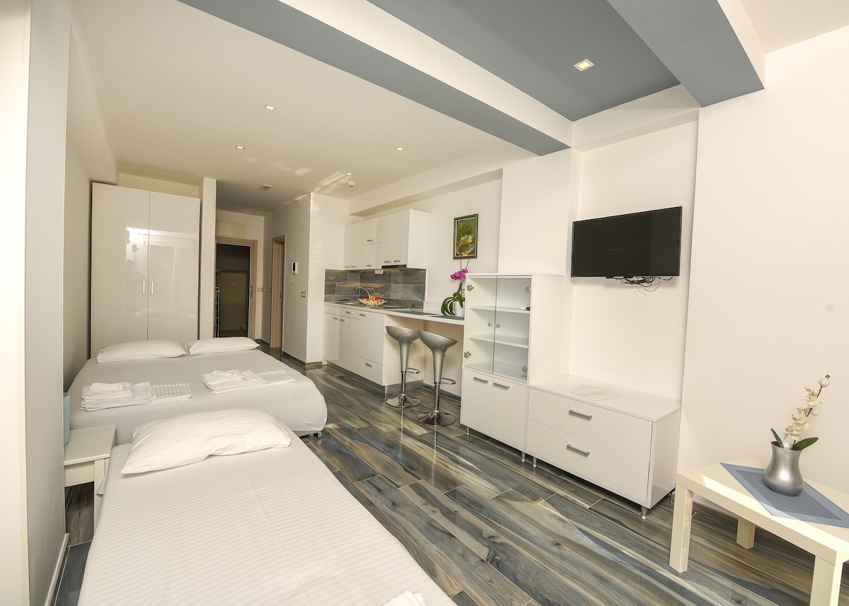 Vsi apartmaji vključujejo sobo, raztegljiv kavč (primeren za spanje dveh oseb), klimatsko napravo, pisalno mizo in televizijo. Vključujejo popolnoma opremljeno kuhinjo z jedilnico in zasebno kopalnico s prho in sušilcem za lase. S terase se razprostira čudovit razgled na morje in goro. Uživanje v sončnem zahodu je zagotovo nekaj, zaradi česar so vaše počitnice nepozabne. Glede na neodvisna mnenja gostje imajo radi ta del Kotorja.