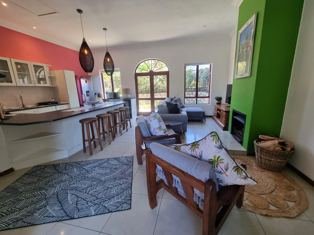 Open space semi-detached cottage, situated in a quiet area of Plettenberg is within 10 minute walk from the beach & a few shops/Cafes It's private entrance & drive way are surrounded by an enchanted, bird heaven garden. The cottage has a well equiped kitchenette, queen size bed, en-suite bathroom. Outside sitting area is equiped with Chairs+umbrella, gas Webber barbecue, outside shower, drying rack, small shared swimming pool Extra: Netflix,washing machine, hair drier, beach towels, Iron.