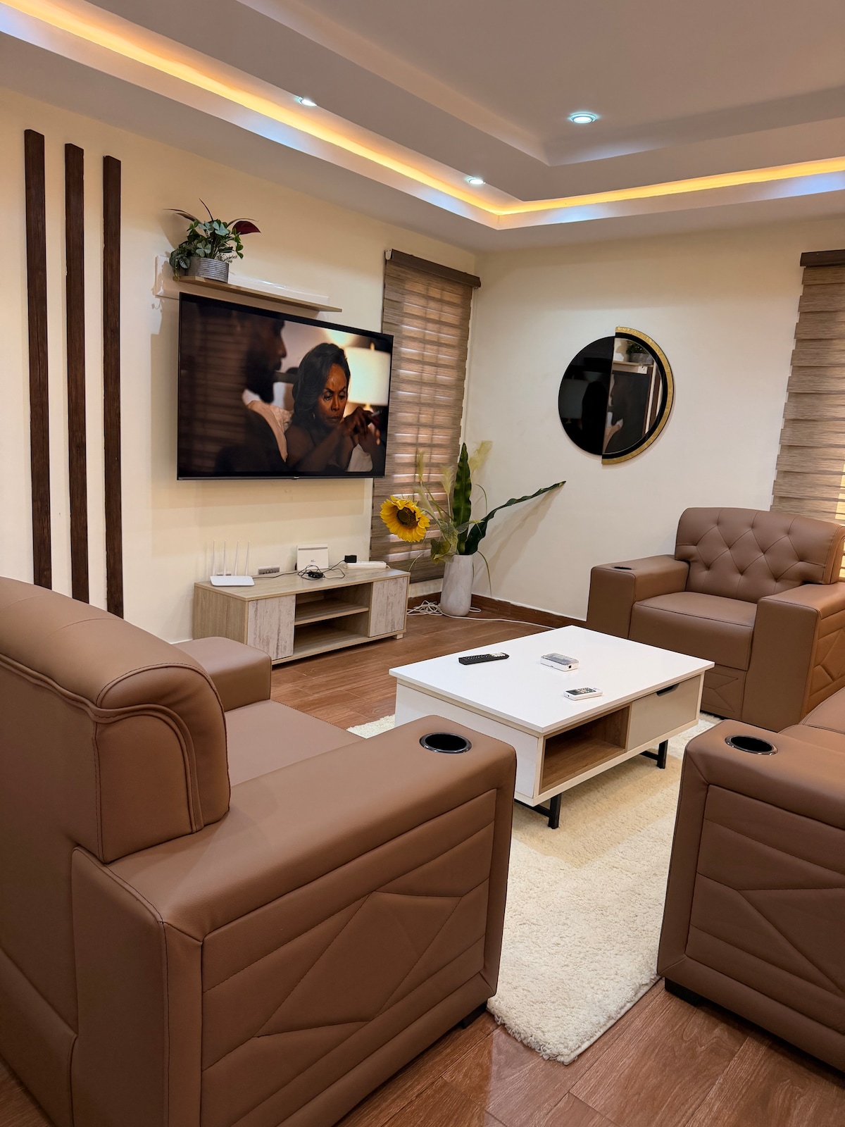 Stanovanje je blizu ameriške hiše, nakupovalnega središča A&C Mall, Melcom ter številnih restavracij in restavracij, vključno s kavnim salonom, KFC, Papa's Pizza itd., kar vam olajša načrtovanje potovanja. Dnevna soba je opremljena s pametnim 43-palčnim Televizija, s katero lahko pretakate DSTV, Netflix, Amazon Prime in Youtube. V spalnici in dnevni sobi je klimatska naprava Na voljo je tudi pralni stroj za pranje oblačil, če načrtujete dolgo potovanje. Na voljo je tudi rezervna sončna energija, če ugasne svetloba