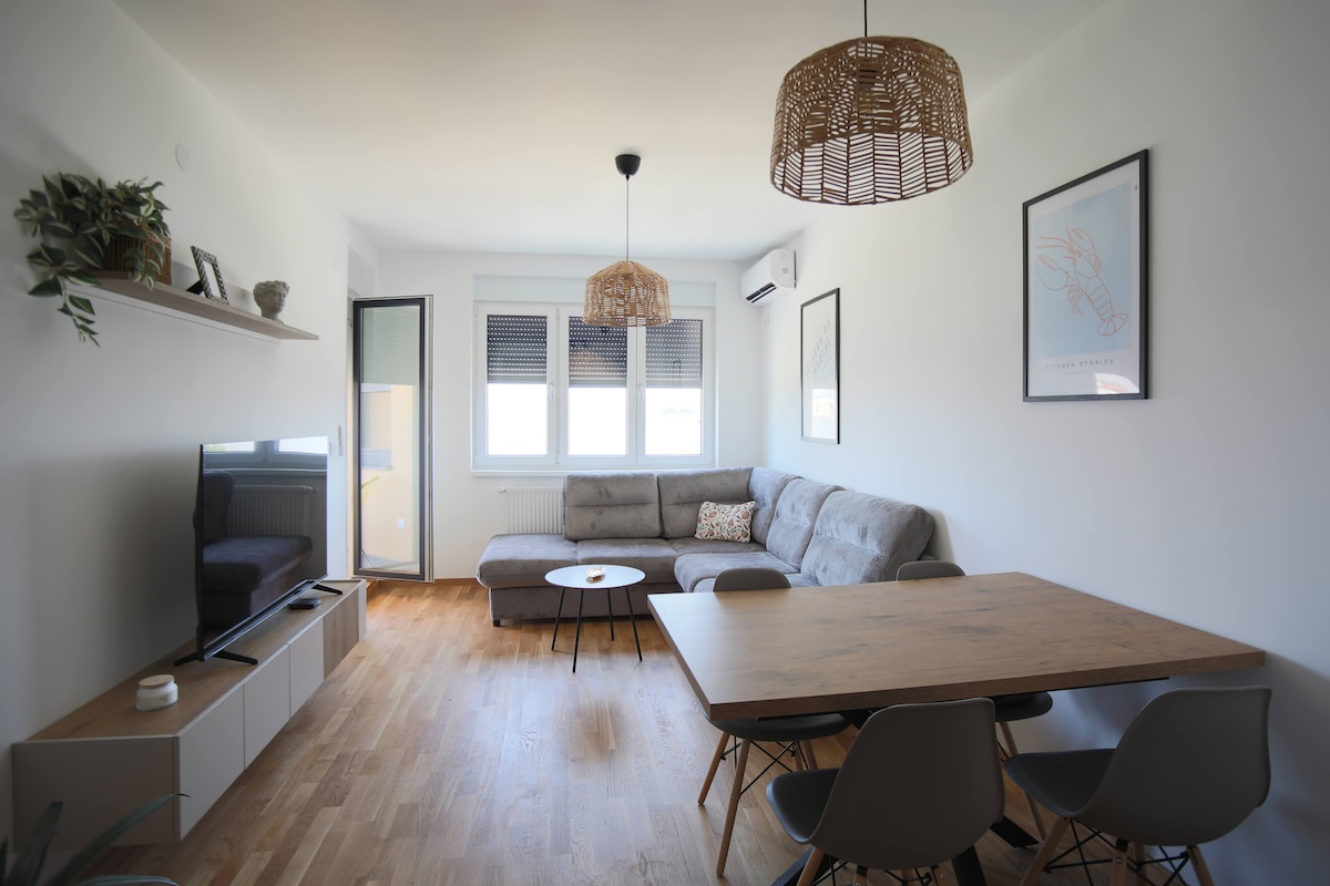 Najino stanovanje je popolnoma novo. Nahaja se v mirnem mestnem območju, le 5 minut hoje od središča mesta. Sestavljen je iz 1 spalnice, 1 dnevne sobe, kuhinje z jedilnico in kopalnice. Sprejme lahko največ 4 odrasle osebe. Stanovanje se nahaja v mirni ulici, zato lahko uživate v počitnicah v miru in tišini. Vse, kar je v našem stanovanju, je skrbno izbrano za vaše prijetno bivanje. Pohištvo in dekoracija sta sodobna in elegantna.