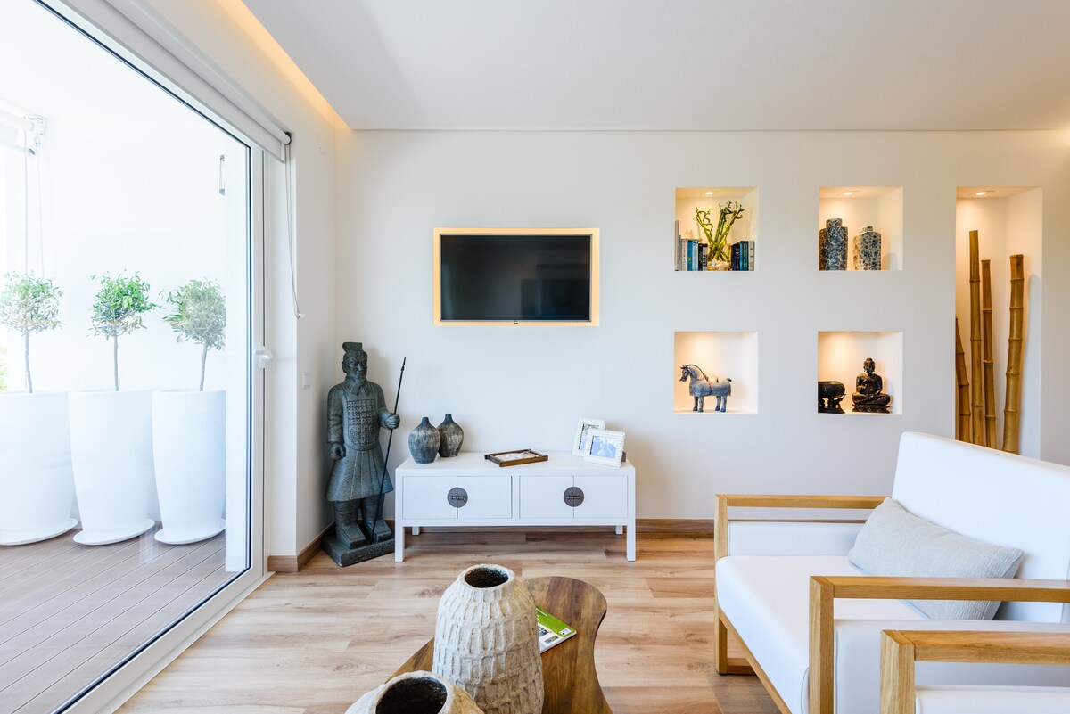Stanovanje blizu plaže s sodobno zenovsko dekoracijo, ki se nahaja v starem delu Albufeire, v osrednjem, vendar mirnem predelu. Brezplačno parkiranje na ulici pred stanovanjem. 300 m od plaže in 450 m od centra vasi. Sprednji balkon s pogledom na vas in ocean. Zadnji balkon z masažno kadjo. Tematske sobe z dostopom do balkona in jacuzzija. 2 kopalnici, popolnoma opremljena kuhinja, dnevna soba s pogledom na morje in panoramska okna. Klimatska naprava, brezplačen BREZŽIČNI INTERNET, kabelska televizija - več kot 100 kanalov.