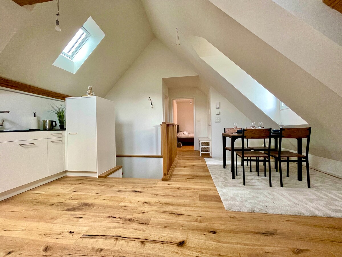 Uživajte v elegantnem doživetju v tem ekskluzivnem podstrešnem stanovanju v Tägerwilenu na jezeru Constance s strešno teraso s površino 40 m2, vklj. Dežna prha, 2 ležalnika in viseča mreža. Od železniške postaje Tägerwilen Dorf (5 min hoje) je le 2 postanka s S-Bahnom do Konstanza. Do Strandbad Tägerwiler Badi am Seerhein se lahko sprehodite v 15-20 minutah. V 2-3 minutah hoje je na voljo naslednja oprema: supermarket Coop, izposoja koles Ehrbar Zweiradhuus, pekarna, mesnica, bankomat.