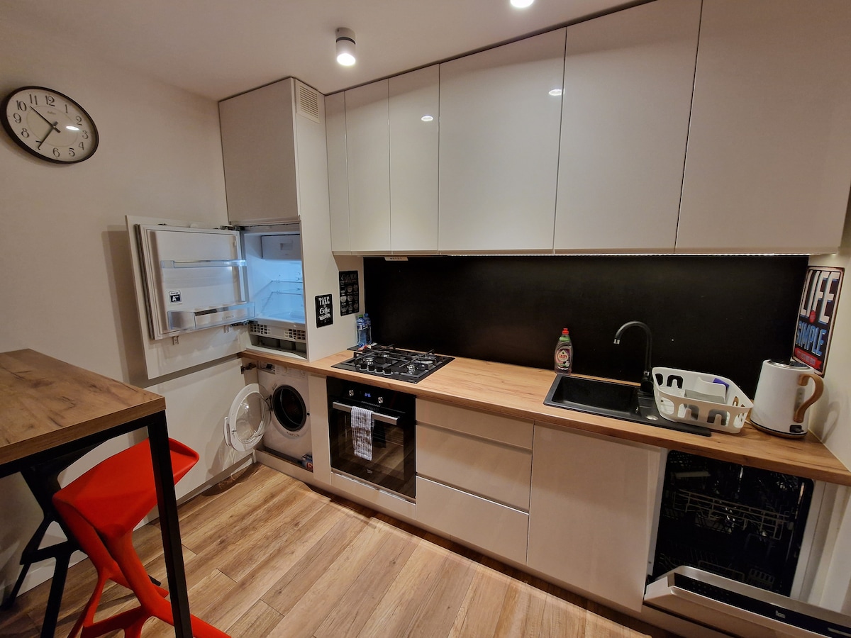 Eklektično urejeno in zelo prostorno stanovanje. 2 spalnici polne velikosti, velika dnevna soba in vsa sodobna oprema: Wi-Fi, delovni prostori, pametna televizija/Netflix, zvočni sistem. Popolnoma opremljena kuhinja: mikrovalovna pečica, pečica polne velikosti, pomivalni stroj, pralni stroj. Centralno ogrevanje: talno ogrevanje na hodniku in v kopalnici. Prvotna obnovljena lesena tla zagotavljajo prijetno in sproščujoče vzdušje.