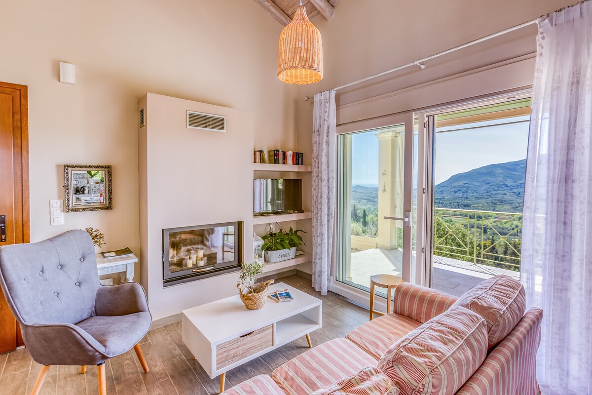 Idealno se nahaja na vrhu gore v osrednji tradicionalni grški vasici Evropouloi, le 10 minut vožnje z avtomobilom od mesta Krfa in letališča Krf ter 20 minut od najbolj znanih plaž , ta osupljiva na novo obnovljena kamnita hiša je idealen kraj za vaše grške počitnice. Osupljiv razgled na jonski kanal do grške celine.