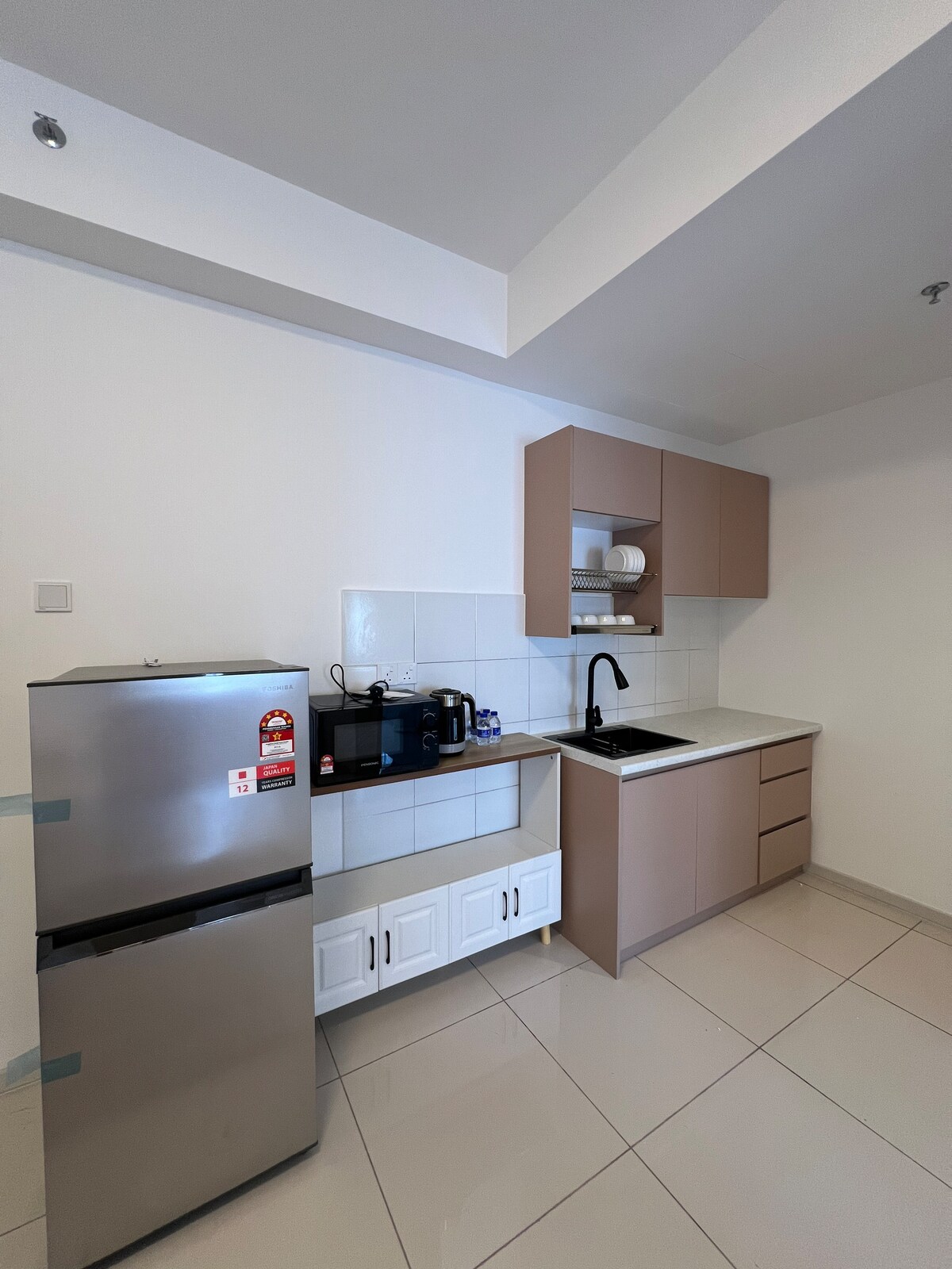 Minimalistična enota z 1 spalnico ima pomirjujočo notranjost, ki je čista in sodobna. V spalnici je zakonska postelja (Queen) z klimatsko napravo. Dnevni prostor je opremljen z udobno sedežno garnituro, pametno televizijo in hitrim Wi-Fi-jem. Kompaktna kuhinjska niša (s hladilnikom, mikrovalovno pečico, grelnikom vode in pripomočki). 🏙️ Nahaja se le 10 minut do KLIA in 5 minut od Mitsui Outlet Parka z opremo v stavbi, kot so bazen, telovadnica in non stop varnost. To je vaša idealna postaja za javni prevoz ali kratek oddih v mestu.