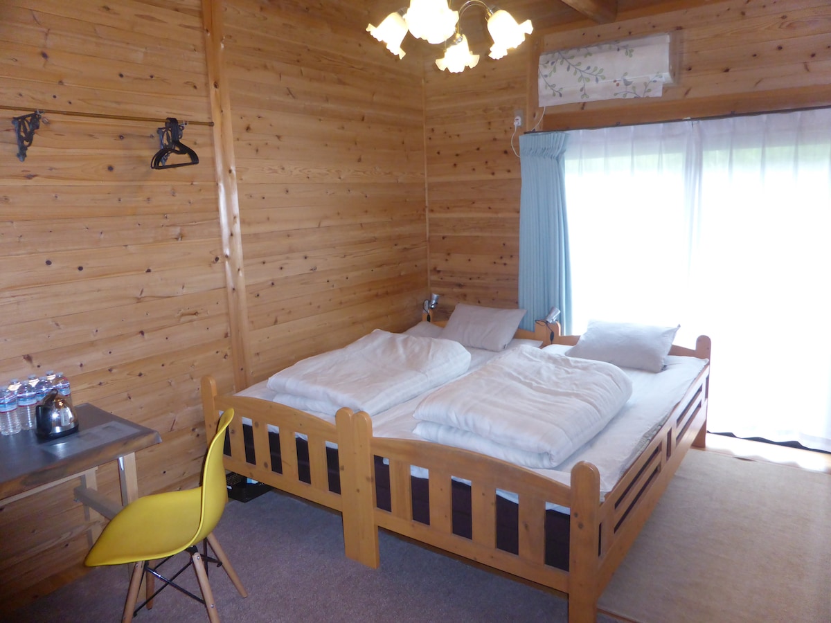 This location is very quiet & secret place for vacation home. There is a small Tatami room like a tea celemony room that you can use as yoga, meditation etc. for your private time. However, no kitchen facility. We provide an electric pot,cups,small dishies, refrigerater, microwave and oven grills toaster, so you can bring some food etc. There is sea and forest view from the guest cottage. Cottage is made in Japanese style with aromatic local cedar wood , open beams, and Shoji screens.