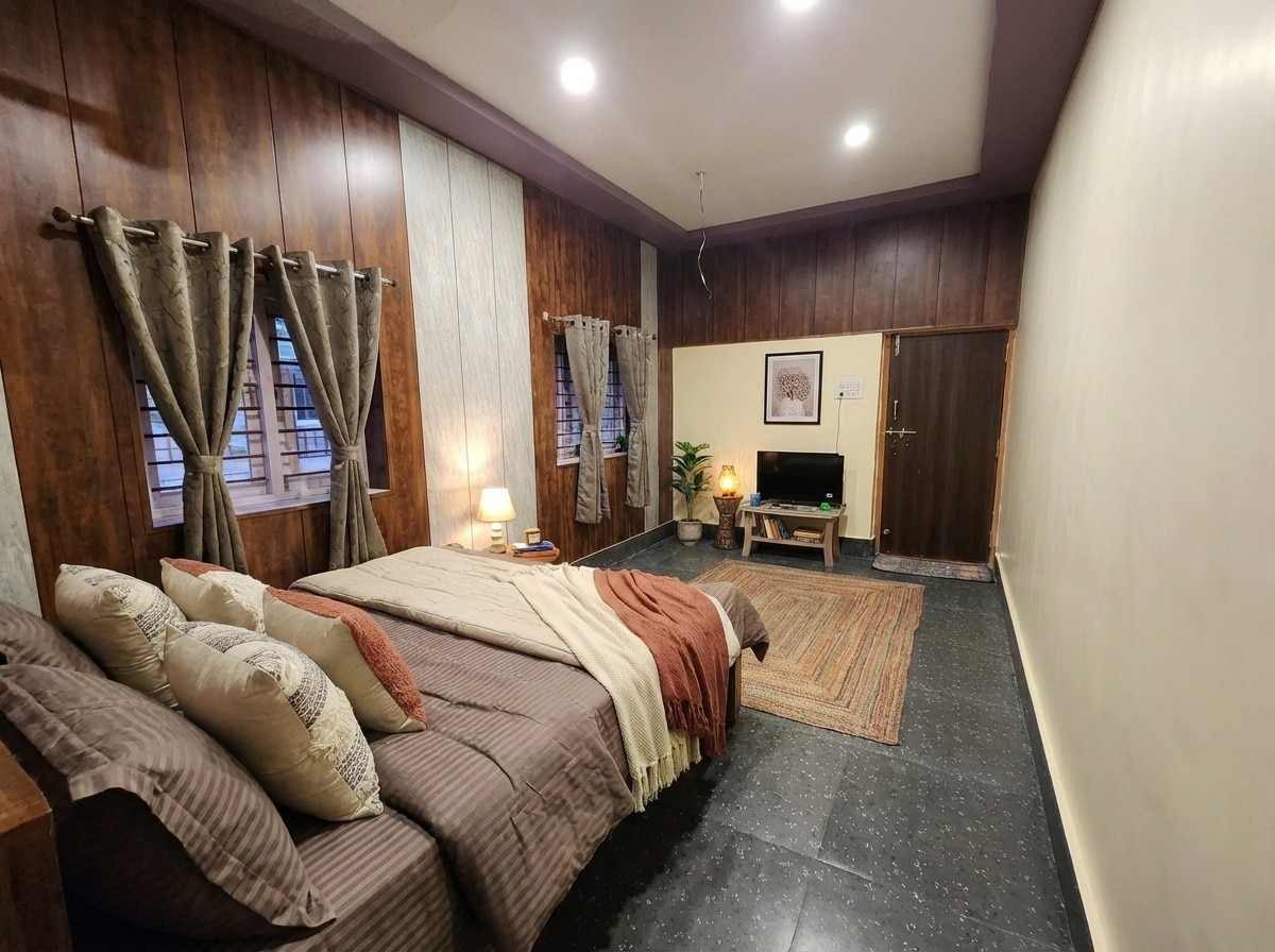 Arriving at Vatika Nature Nest in Gokarna, you are welcomed by an adorable small lawn that prepares you for some peace. The villa boasts four super spacious rooms, each offering a perfect blend of comfort and style. Around the rooms there is a lovely bonfire pit where families and friends can recline under stars and exchange stories. The gentle noise of a stream that is nearby heightens the sense of peace thus forming a soothing background.
