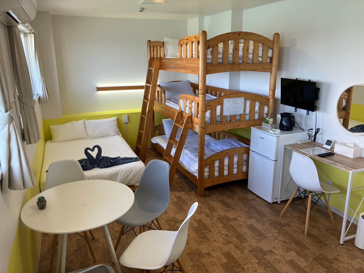 Hotel, ki lahko sprejme do 2 osebi v vseh sobah s pogledom na ocean!! Priporočam ga za poslovna potovanja in še več. Postelja je 1 delno dvojna. Nahaja se skoraj v središču glavnega otoka Okinawa in je od letališča Naha oddaljen približno 45 minut vožnje. Ima odličen dostop do znamenitosti na Okinawi, skritih plaž ter kotičkov ob sončnem vzhodu in zahodu. Razdalja med morjem in hotelom je bližje kot kjerkoli drugje. Zbudite se ob zvoku ptic, ki cvrčijo, in ob jutranjem zvoku valov. Sprehod pred plažo bo povzročil topel dan, ki se bo dvignil z morja. Čez dan se lahko igrate z barvitimi tropskimi ribami v kristalno čistem oceanu. Če ste malo utrujeni, lahko uživate v zvoku valov, medtem ko čutite veter. Ponoči lahko iz sobe vidite zvezdno nebo, ki opazuje zvezde.Med polno luno nočjo mesečina odraža morje in je čudovita cesta. To je kraj, kjer se lahko sprostite in obogatite, samo na Okinawi.Sproščujoče potovanje z vašimi najdražjimi bo spomin na vse življenje. Na voljo je izposoja koles!! Kolesarite lahko udobno ob morju (^ ^) * Strošek bo zaračunan.Če ga želite uporabiti, se vnaprej obrnite na nas.