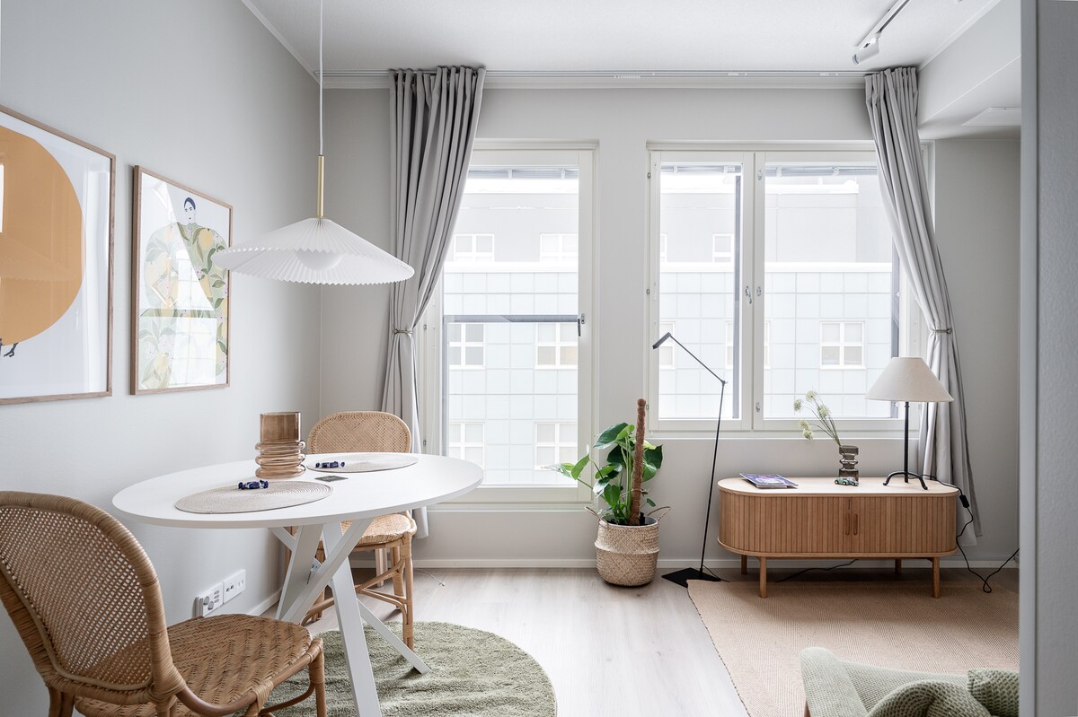 Udobno enosobno stanovanje v pristaniškem okrožju Kuopio. Uživajte v bivanju v tem udobnem stanovanju z zasebno savno, klimatsko napravo, zastekljenim balkonom, dobro opremljeno kuhinjo, hitrim Wi-Fi-jem in namenskim parkirnim mestom z vtičnico za grelnik motorja. Za 1–4 goste. Posteljnina in brisače so vključene. Odlična lokacija le nekaj korakov od pristaniških restavracij ter plaže in parka Väinölänniemi. Center mesta, tržni trg in tržnica so oddaljeni 800 m hoje.