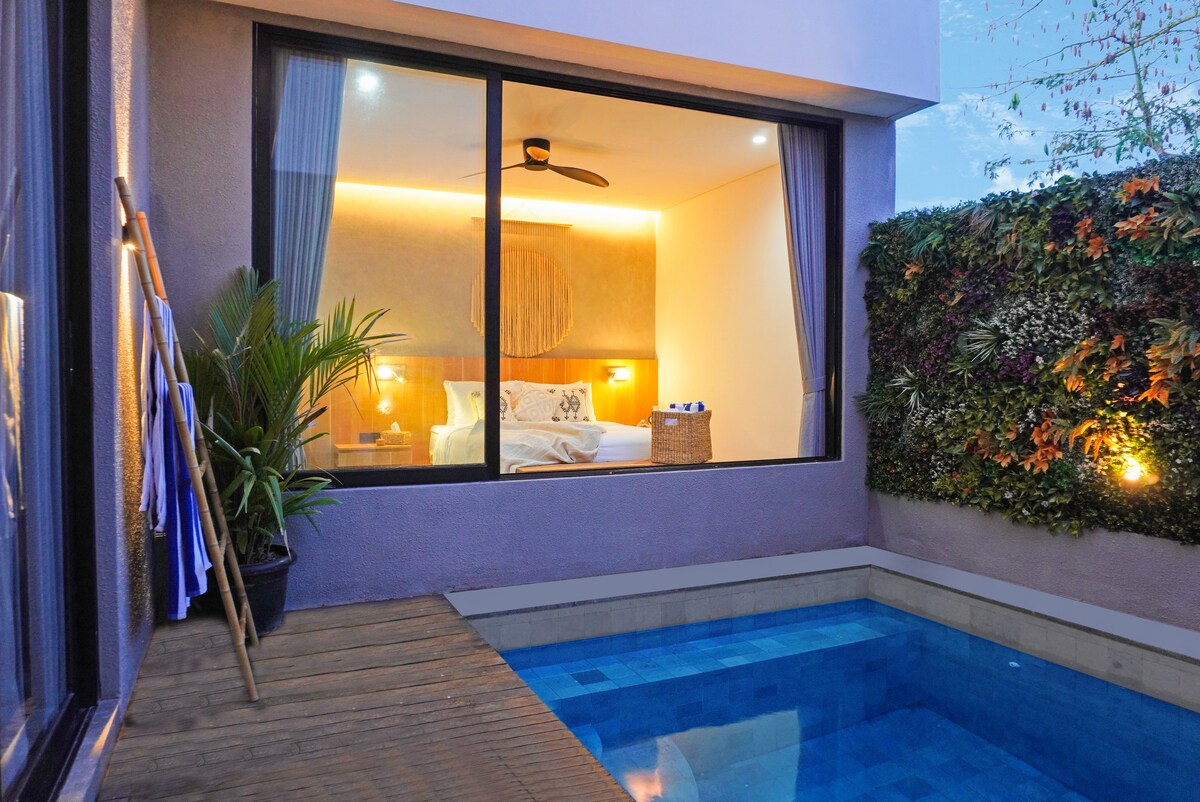 Modern 1BR villa with private pool in prime Ungasan: • Chic bedroom with designer lighting & full-glass walls • En-suite bathroom with premium amenities • Private pool with glowing lights & lush tropical garden • Lounge corner with woven pendant lamps • Fully equipped kitchen & dining area • 300 Mbps Wi-Fi • Daily cleaning with fresh towels & linens included • Netflix, PS5, baby amenities on request • Concierge for scooter rental, tours & more • Pet-friendly • IDR 500,000 refundable deposit