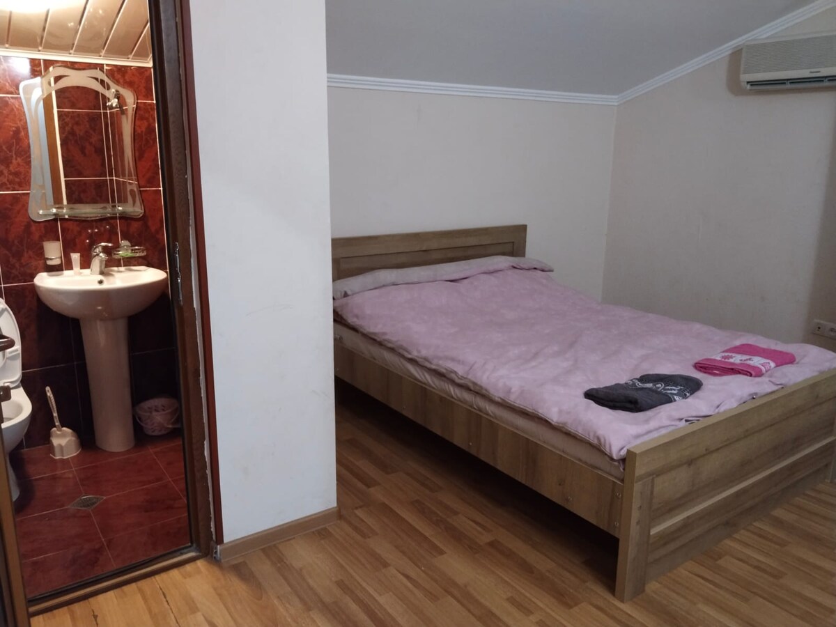 Dobro ogrevanje pozimi in klimatska naprava poleti. Zasebna kopalnica v sobi, delovni prostor, garderobna omara in TV. V nadstropju so samo 3 sobe. Stabilen in hiter internet. Skupna kuhinjska niša v nadstropju: mikrovalovna pečica, grelnik vode, hladilnik, posoda. Velik balkon v tretjem nadstropju s pogledom na gore in stadion. Do ogromne tržnice, avtobusne postaje, parka, bazena in stadiona se lahko sprehodite.