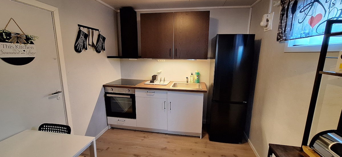 Apartment close to city centrum, in the older part of town. Its a minimalistic style, with a calm atmosphere. Enjoy your favourite tunes over the stereo while you prepare your day with adventures. 2 bedroom apartment, with all kitchen appliances available, and a smal porch (great in the summer) Master bedroom: Kingsize bed with medium and firm mattress. A proper wonderland bed. Bedroom: Queen size bed with a soft top mattress. The apartment is on the ground floor (1 etasje)
