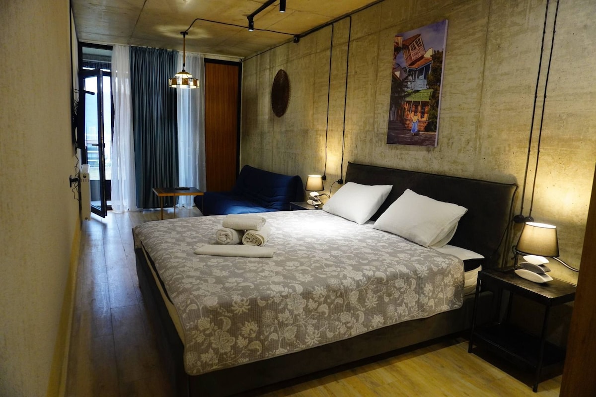 Na novo prenovljeno stanovanje se nahaja v osrednjem delu Tbilisija. Udobno in sončno stanovanje se nahaja v 6. nadstropju, z velikim balkonom in čudovitim panoramskim razgledom na mesto. Stanovanje je popolnoma opremljeno z vsem, kar potrebujete. Stanovanje ima eno spalnico, eno kopalnico, dnevno sobo v garsonjeri s kuhinjo in balkonom. Sprejme lahko do 3 osebe. V spalnici je zakonska postelja, v dnevni sobi pa raztegljiv kavč. Pred stavbo je parkirno mesto.