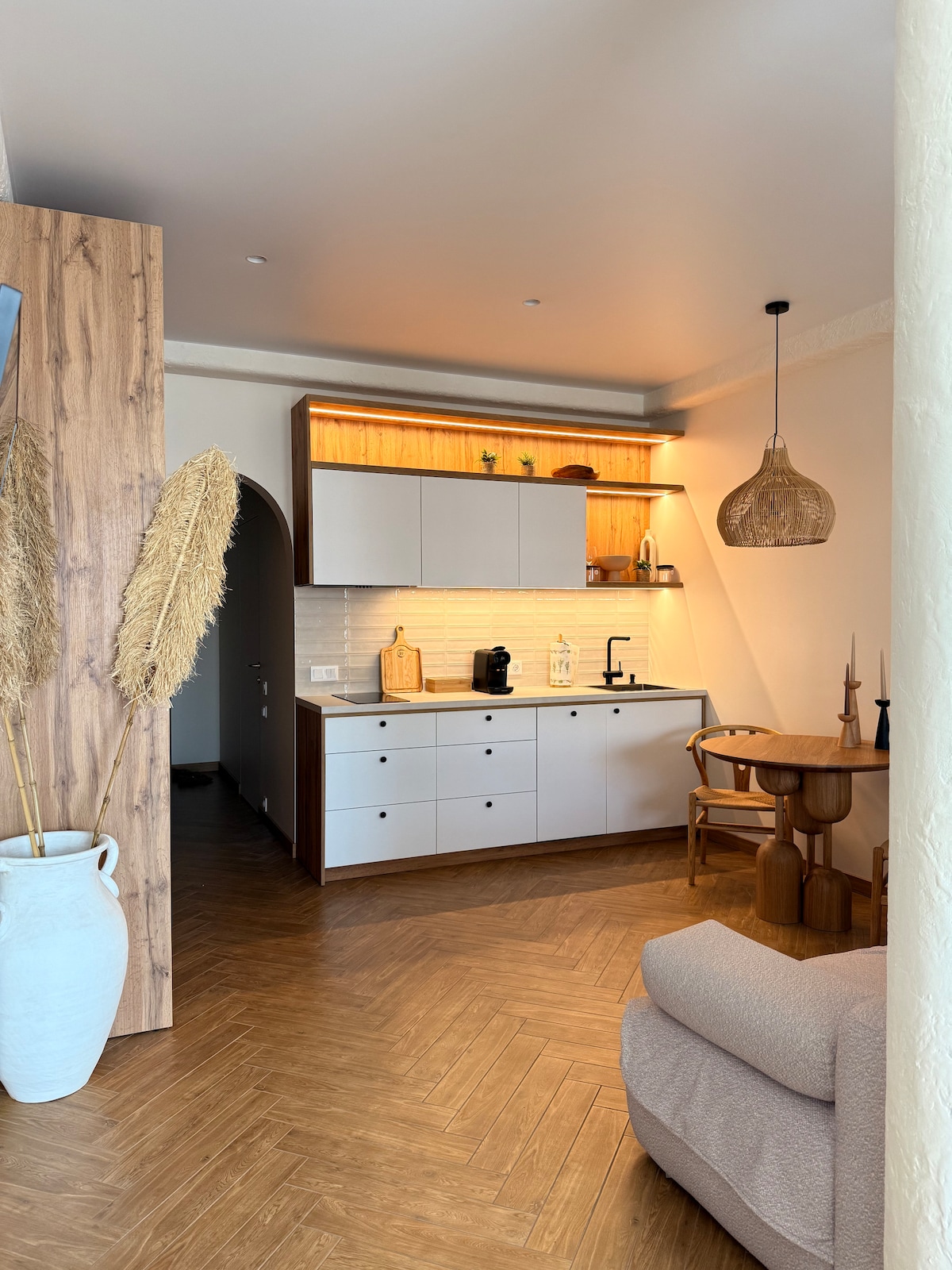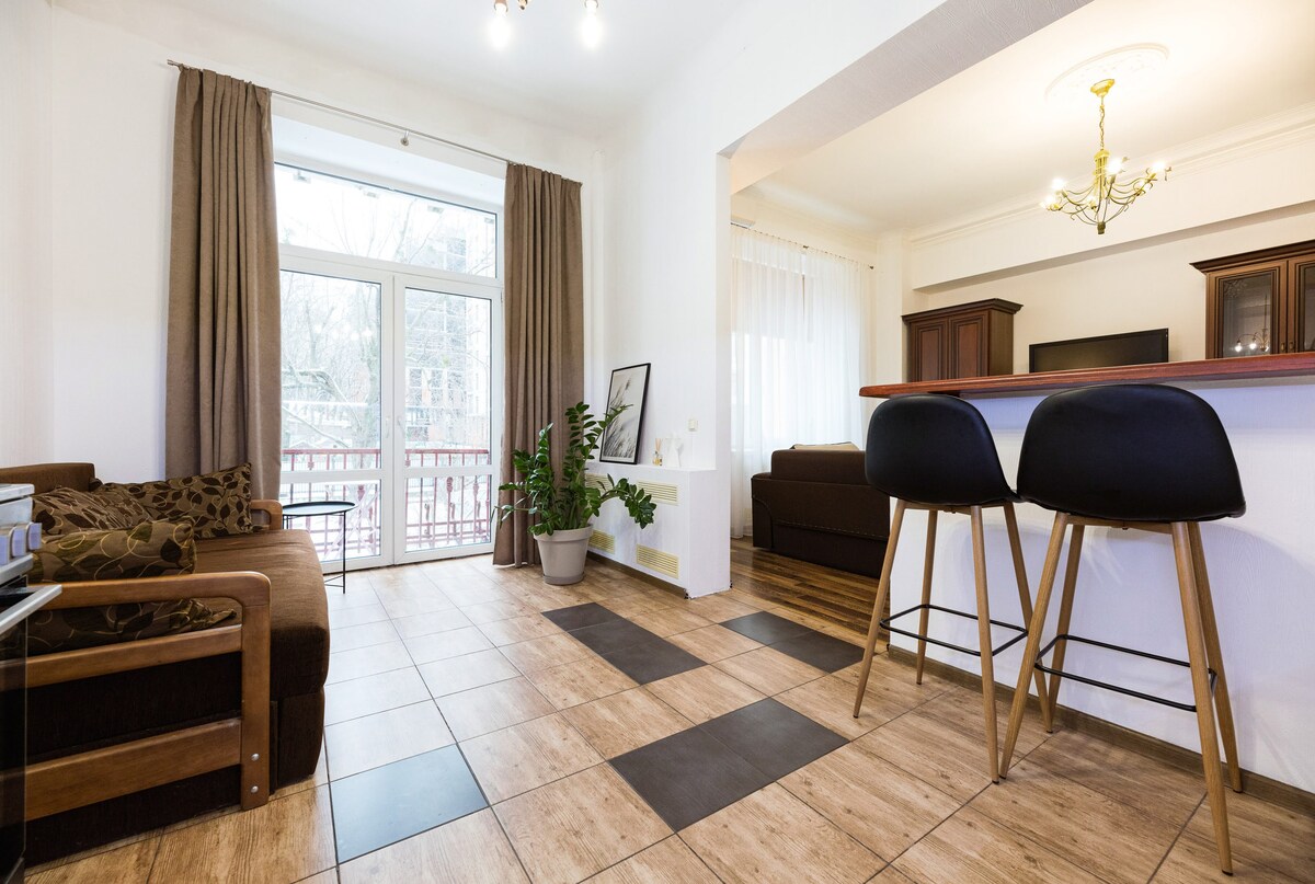 Odkrijte minimalističen mir v našem dizajnerskem enosobnem stanovanju v osrčju Kijeva. Prostor: zakonska postelja (Queen), pametna televizija, klimatska naprava in hitra povezava Wi-Fi. Kuhinja: popolnoma opremljena s kavo/čajem. Lokacija: nova stavba v bližini postaje metroja »Universytet« in parka Ševčenko. Mirno, a le nekaj korakov od najboljših kavarn. Prednosti: zasebni balkon, pogled na mesto in enostaven samostojni vstop. ✨ Čisto, mirno in na popolni lokaciji. Rezervirajte svoje edinstveno doživetje v slogu Japandi še danes!