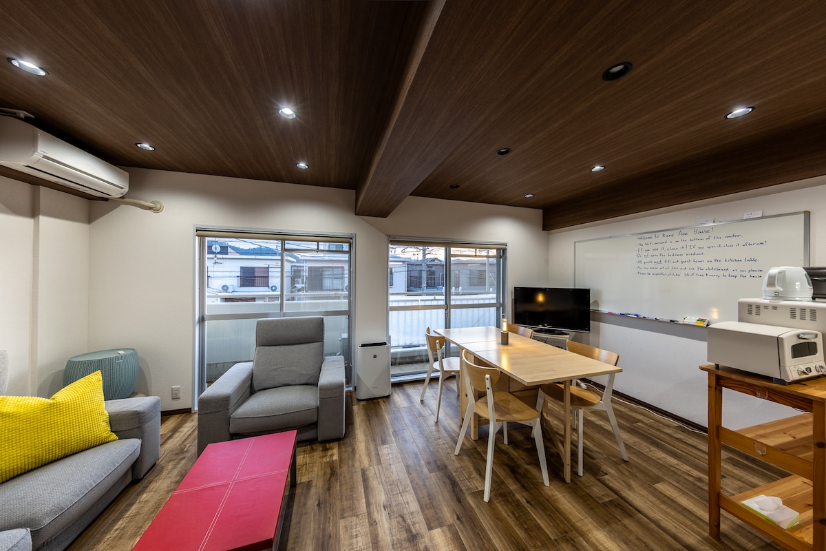 Ta najem, ki je kot nalašč za oglede znamenitosti v Kjotu, družini in prijateljem, je omejen na eno skupino na dan in je popolnoma zaseben. Med bivanjem lahko uporabljate celotno leseno dvonadstropno stavbo (3LDK) velikosti približno 120 m ². Tloris Pritličje: dnevna soba, jedilnica in kuhinja, kopalnica, umivalnik, stranišče 2. nadstropje: 3 sobe v zahodnem slogu (od katerih ima ena verando) 🛏Sprejme lahko največ 6 gostov, odličen pa je tudi za družine in majhne skupine. [Dostop in parkiranje] Pred stavbo je eno namensko parkirno mesto, ki lahko sprejme avtomobil standardne velikosti. Poleg tega je približno 30 m stran parkirišče, ki ga lahko plačate z žetoni, zato lahko prenočišče dosežete tudi z avtomobilom. [Oprema in objekti] ▪️Kopalniška oprema, kot so kopalne brisače, brisače za obraz, šampon, balzam in milo za telo ▪️Obešalniki, sušilnik za lase, pralni stroj ▪️brezplačen Wi-Fi ▪️Klimatizirano (vsaka soba) ▪️Kuhinjska posoda in namizni pribor sta prav tako popolnoma opremljena, zato si lahko sami pripravite obroke Čeprav je star, je dobro očiščen in upravljan, tako da lahko uživate v udobnem bivanju.