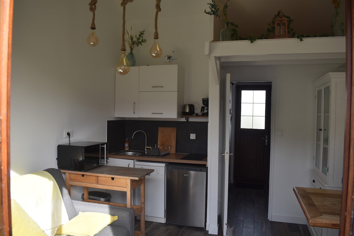 Logement indépendant, mitoyen avec les propriétaires. Entrée indépendante, donnant sur route. Composé d une salle d eau avec WC, porte coulissante,d une cuisine (plaque, four,micro-ondes ,réfrigérateur, cafetière filtre,cafetière Nespresso, bouilloire, grille-pain), d'un espace salon(BZ)/s à manger. Un escalier de meunier avec rambarde vs mène à l étage. Velux.Divers rangements. Une place de stationnement se trouve sur le trottoir d'en face. Pour 1 nuit il vs faut ramener draps et serviettes.