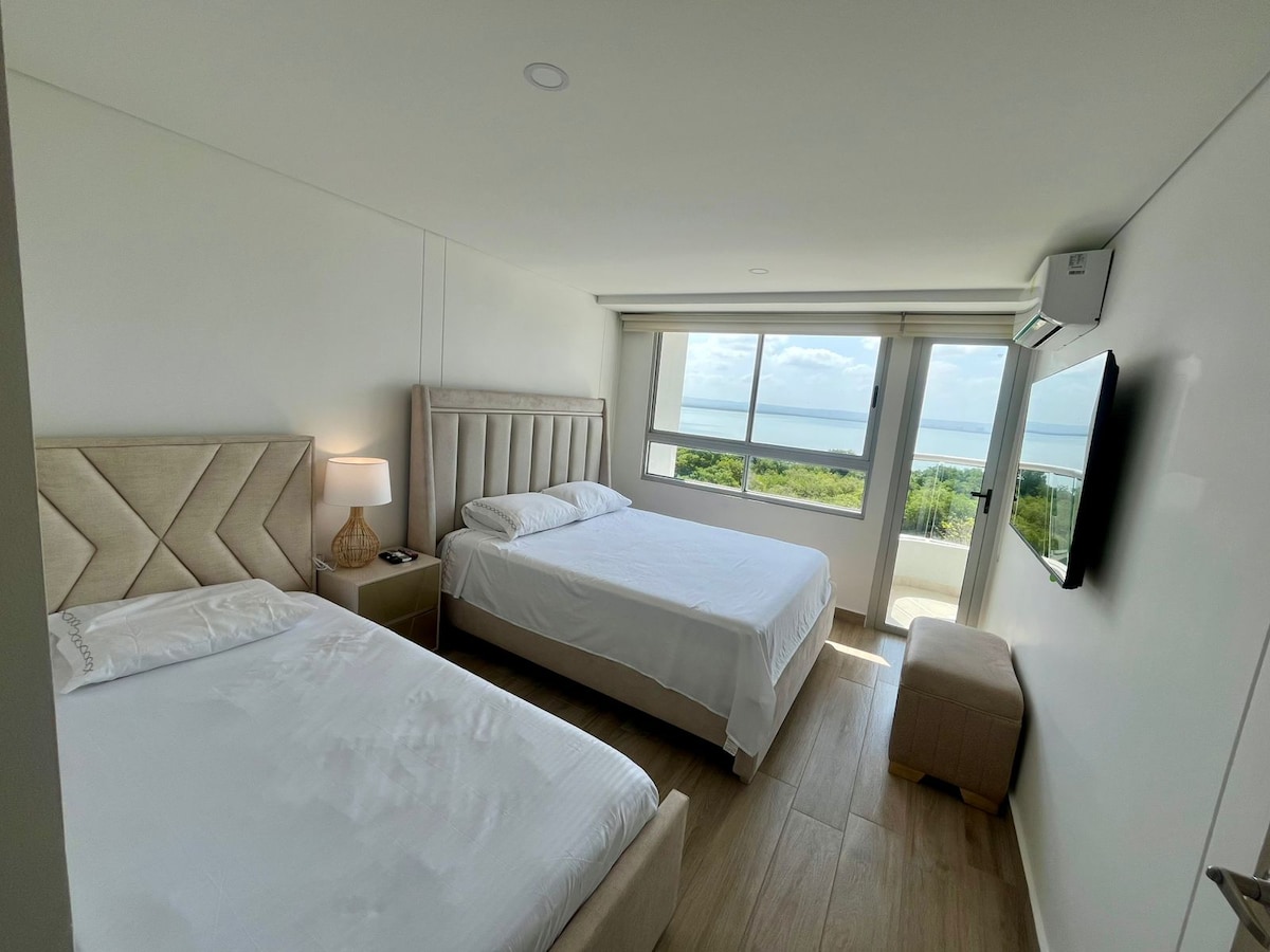 Ekskluzivno stanovanje v stavbi ob plaži z neposrednim dostopom do peska. Le 7 minut od zgodovinskega središča Cartagene, ki je kot nalašč za uživanje na Karibih. Spalnica z zakonsko posteljo (Queen) in raztegljivim kavčem (180x110 cm) v dnevni sobi 🛁 2 kopalnici 🌅 Zasebni balkon z visečo mrežo 🏊 2 bazena (en ob plaži), masažna kad in savna 💪 Telovadnica, otroški prostor in zasebno parkirišče Wi-Fi s hitrostjo 📶 300 Mb/s – idealno za delo na daljavo 🍽️ Blizu restavracij, barov in supermarketov Otroška posteljica je na voljo na zahtevo