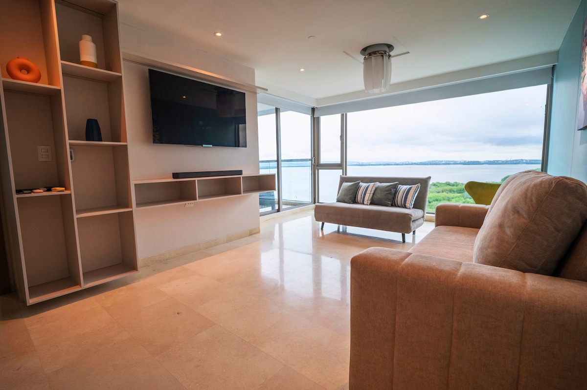 Ekskluzivno stanovanje v stavbi ob plaži z neposrednim dostopom do peska. Le 7 minut od zgodovinskega središča Cartagene, ki je kot nalašč za uživanje na Karibih. Spalnica z zakonsko posteljo (Queen) in raztegljivim kavčem (180x110 cm) v dnevni sobi 🛁 2 kopalnici 🌅 Zasebni balkon z visečo mrežo 🏊 2 bazena (en ob plaži), masažna kad in savna 💪 Telovadnica, otroški prostor in zasebno parkirišče Wi-Fi s hitrostjo 📶 300 Mb/s – idealno za delo na daljavo 🍽️ Blizu restavracij, barov in supermarketov Otroška posteljica je na voljo na zahtevo